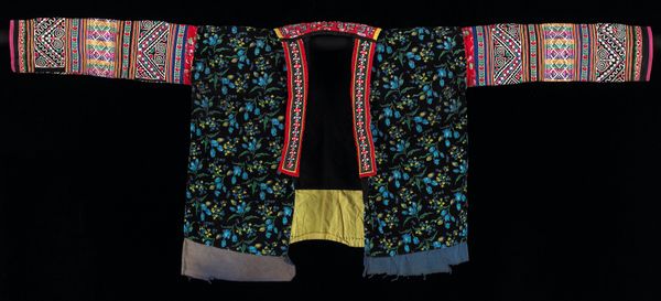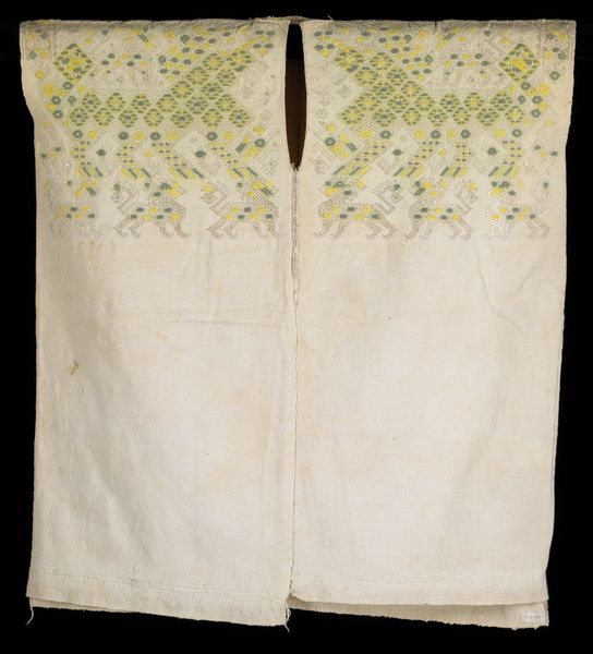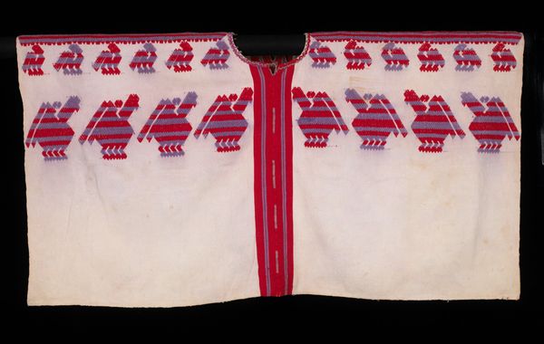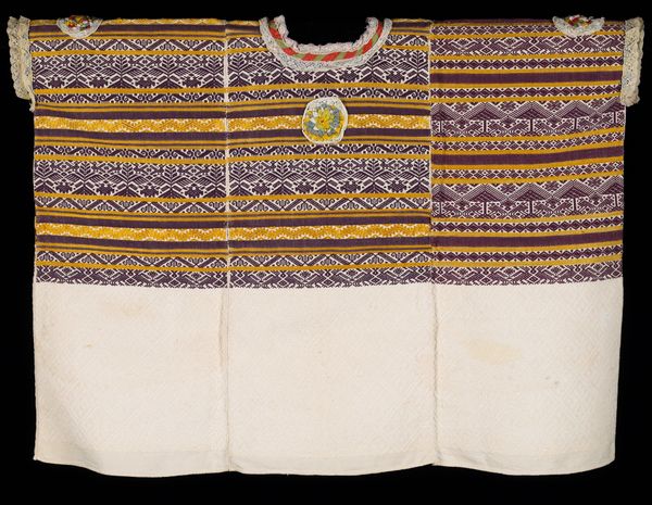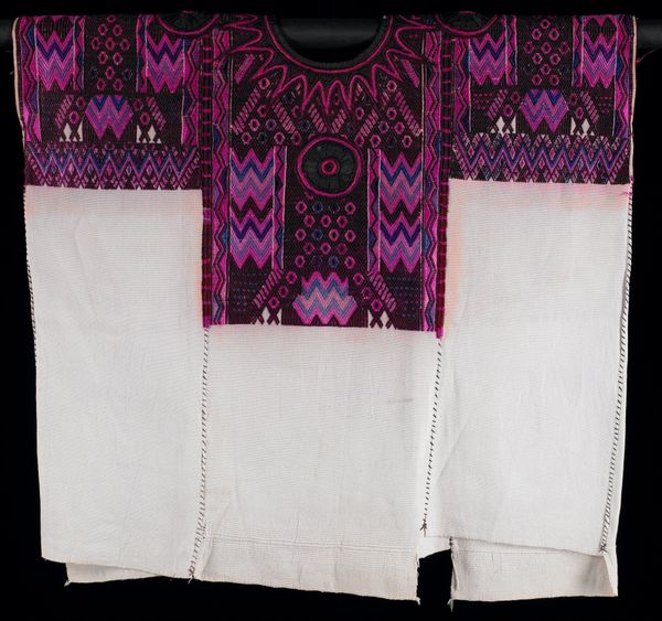 Curator: Immediately, my eye goes to the vibrant tapestry at the top – a burst of color against the stark white. It almost feels like a secret garden blooming on the wearer’s shoulders. Editor: Precisely. What you're seeing is a "Huipil," a woman’s blouse crafted around 1965. The materials used are cotton and silk, telltale signs of sophisticated textile traditions from the Maya people. The Minneapolis Institute of Art is fortunate to hold it in its collection, providing a tangible link to the cultural politics embedded in textiles. Curator: It speaks to the ingenuity inherent in folk art, right? Imagine the hours, the stories woven in. You know, textiles were more than just clothing – they were literally carriers of identity, of community. Editor: Exactly! And the visual vocabulary on display – all those repeated geometric motifs, the layering of patterns – would convey social status, regional identity, and even cosmological beliefs within Maya communities. Curator: It's interesting, though. Look at how the bright bands of color seem almost contained, held above all this pure white space. There’s a tension here, maybe reflecting some societal pressure between tradition and perhaps an encroachment of Western cultural values. Am I off-base there? Editor: Not at all. Postcolonial contexts inevitably shape such folk traditions. It's fascinating to consider how such pieces negotiated the increasing visibility and marketability of Indigenous arts during the mid-20th century. Was this Huipil intended solely for local wear, or partly for sale and wider cultural consumption? Those kinds of questions are crucial. Curator: The hand-embroidered nature and that incredible amount of detailing, too... It really underscores the role of women as keepers and transmitters of cultural heritage, don’t you think? Their hands are, in essence, weaving history. Editor: Undeniably so. The meticulous production underscores the communal, almost ritualistic importance of weaving and the critical roles women played. Also, how they adopted and perhaps adapted traditional designs amid the growing availability of industrial dyes is interesting. Curator: Seeing something so vibrant, so clearly handmade amidst all this modern machine-made culture feels like a breath. A shout of, ‘Hey, we’re still here!’. Editor: And hopefully museums, by exhibiting objects like this "Huipil," actively contribute to amplifying that shout, respecting its layered histories and advocating for its continued resonance.