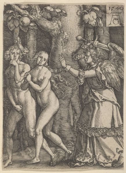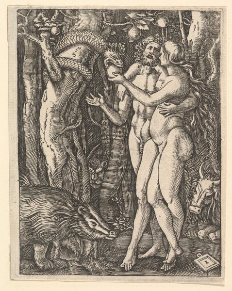 Here we see an engraved copy of "The Little Passion", created by Albrecht Durer in the early 16th century. The composition is densely packed, with figures of Adam and Eve surrounded by a dark, ominous forest. The texture is rich, achieved through fine, detailed lines that define forms and create shadow. The focal point is the moment of temptation, with Eve receiving the apple from Adam, offered by the serpent coiled around a tree. Durer uses a structured approach here to explore the theme of original sin. The characters are placed within a semiotic landscape – the forest, with its lurking creatures, functions as a signifier of danger and the loss of innocence. Through his calculated use of line and form, Durer invites us to consider not just the biblical narrative, but its broader implications for human nature and moral understanding, challenging viewers to reflect on the nature of choice and its consequences.