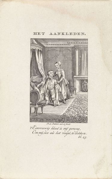 Curator: This piece, entitled "Kinderen zitten geknield in gebed bij kindermeisje"—"Children Kneeling in Prayer with Nanny," if my Dutch serves me—was rendered in 1789 by Barent de Bakker. Editor: Immediately, the candlelight strikes me, so faint and yet it carves out a space of shared devotion. But there’s also this weight... something about the arrangement of bodies suggests a hierarchy, a kind of social positioning. Curator: Ah, context. We’re in the late 18th century. Engravings like these circulated widely. It speaks to Baroque sensibilities: a didactic genre scene aiming to instill moral virtue. Editor: Instill? Or impose? I'm curious about the power dynamics implicit in prayer. The nanny figure presides over this act of supplication... Who gets to dictate the terms of piety here? It's interesting how she looms—physically and ideologically. And who is included? Where are other potential marginalized communities within this structure? Curator: Well, observe how their hands clasp—the gesture itself becomes a unifying motif, regardless of individual volition, right? Yet the children, notice their varied expressions! Some seem genuinely immersed, others almost...resigned. The youngest, tugging at the nanny's skirt. Pure narrative. Editor: I am especially mindful of these figures positioned on the floor: their placement signals submission, underscoring the nanny’s authority within the domestic space. This act of devotion, therefore, operates less as personal transcendence and more as social conditioning, teaching the young, the marginalized to occupy specific places within their environment. I find this image both aesthetically beautiful and fraught with meaning! Curator: Indeed. What I appreciate most is the balance between the personal and the prescribed. The engraving is not only an artifact of its time, it makes me think of those quiet, flickering moments we each encounter, somewhere between faith and circumstance, maybe doubt. Editor: Yes. Ultimately, this image makes visible the nuanced relationship between childhood, control, and spiritual performance, a necessary reflection for any understanding of the social environment that it sought to promote.
