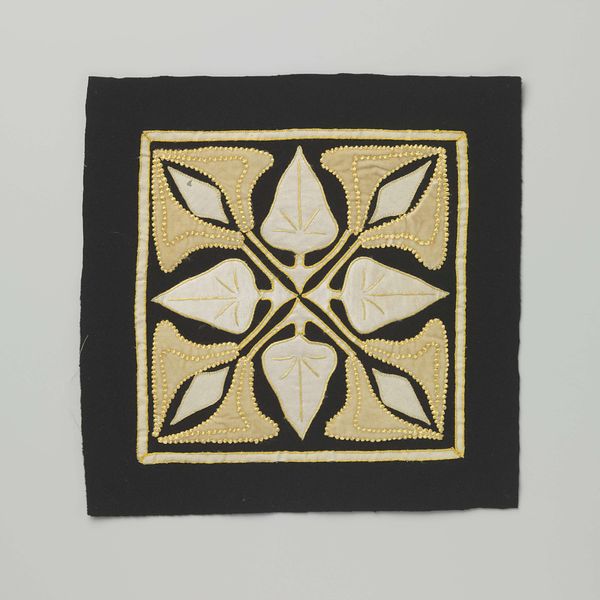 This is a gold thread embroidery on dark blue-green cloth, made by Industrieschool De Windroos. The square composition is structured by an interplay of gold lines that frame a series of meticulously embroidered motifs. These aren't randomly placed; the composition suggests a deeper order, a hidden symmetry. The use of gold thread creates a shimmering effect against the dark background, drawing our eyes into the details of each motif. The floral and heraldic designs, while traditional, are rendered with such precision and care that they seem to question the very nature of ornamentation and decoration. Are these simply aesthetic flourishes, or do they encode a more profound message? Consider the contrast between the rigid geometric lines and the organic forms of the embroidered elements. This tension destabilizes the fixed categories of art and craft. It invites us to question the established meanings and values we assign to such objects. What we are left with is not just a beautiful piece of needlework, but an intricate exploration of form, function, and the very nature of representation.
