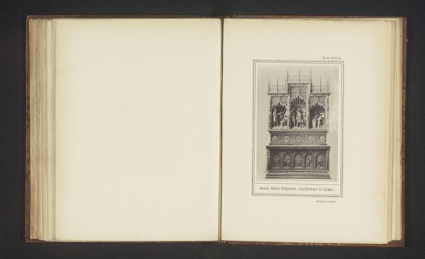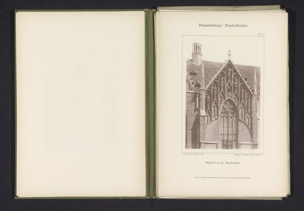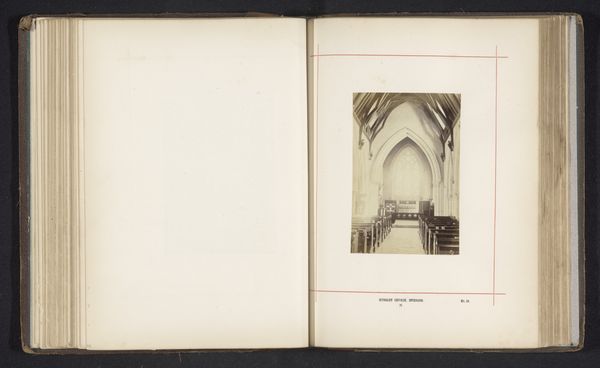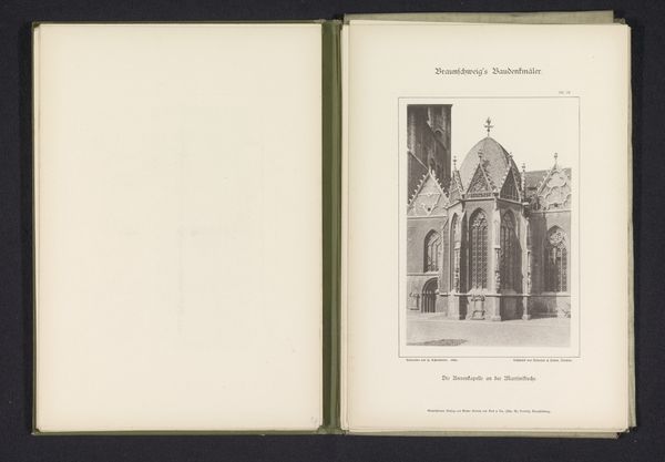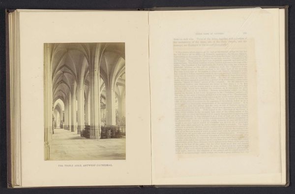 Editor: So, here we have J. Schombardt’s "Interieur van de noordelijke zijbeuk van de Dom van Braunschweig," created in 1892. It seems to be an image from within a book or journal. It's really fascinating how the image itself almost seems secondary to the presentation of the book, the texture of the paper really stands out to me. What strikes you about it? Curator: Seeing this image presented within what appears to be a bound volume immediately brings to mind the labor involved in both its production and reproduction. Consider the sourcing and treatment of the paper itself in 1892. What processes were employed, what were the material conditions of the laborers who created these books? Editor: That’s a perspective I hadn’t considered! So you are thinking more about the making, and not necessarily the image? Curator: Precisely. While the image depicts the interior architecture of a grand cathedral, the reality of the artwork presented before us resides in the paper, ink, printing methods, and binding. Furthermore, the act of including printed text surrounding the photographic print within the journal itself blends artistic intention with utility; the photograph acts more as material documentation than aesthetic wonder. What do you make of the aged aesthetic? Editor: Well, I find it interesting that this process creates a seemingly aged document right from the start, lending a sense of history and authenticity. How do you think its original audience might have reacted to it? Curator: They may have appreciated the image itself and found beauty or intrigue, as some viewers do today. Yet focusing on the material reality, we uncover not only intended purposes of display, but also hints on the cultural values that framed how this book came to be conceived and consumed in nineteenth-century Germany. Editor: That definitely gives me a lot to think about – the social and economic contexts surrounding the creation of the image itself. Thank you, it has really widened my scope of understanding! Curator: My pleasure. Hopefully it underscores the rich material considerations one must have to appreciate even images within books.