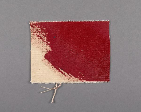 Curator: Here, we have Barnett Newman’s “Painted canvas fragment,” dimensions roughly 5 by 4 and a half inches. Editor: It's like a tiny scream of red fading into…what, acceptance? Or maybe just exhaustion. The raw edges add to that sense of vulnerability. Curator: Indeed, the diagonal division speaks to Newman’s interest in the sublime and the zip, though rendered here with a sort of ghostly gradient. Editor: I’m intrigued by what this fragment was once part of. Was it meant to be larger, grander? Is its power amplified by this forced intimacy? Curator: It's a beautiful question. By isolating such a small area, we become intensely aware of texture, of the weave and the subtle gradations of color. Editor: I suppose it is a reminder that even fragments can resonate with immense feeling. Makes you wonder what stories such small bits could tell.