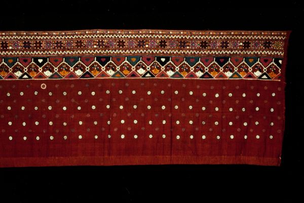 This 'Valance' was crafted with embroidery. The eye is immediately drawn to the prominent display of floral and fruit motifs. These symbols resonate deeply within the collective unconscious; fruits, particularly, have been associated with fertility, abundance, and the sensual pleasures of life across cultures. Consider, for instance, how the pomegranate, bursting with seeds, appears in Renaissance paintings as a symbol of prosperity, or in ancient Greek myths associated with Persephone and the cycles of life and death. Here, these motifs are meticulously stitched, capturing their symbolic weight and continuing a long tradition of employing nature's bounty to convey profound emotions. It is an example of how our ancestors used symbols to imbue their everyday lives with deeper meaning. The image of this Valance evokes the perpetual return of symbols, their evolution through different cultural landscapes, and their persistent influence on our shared human experience.