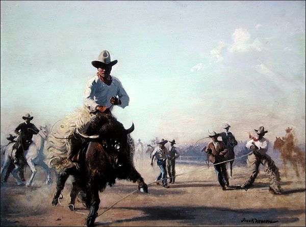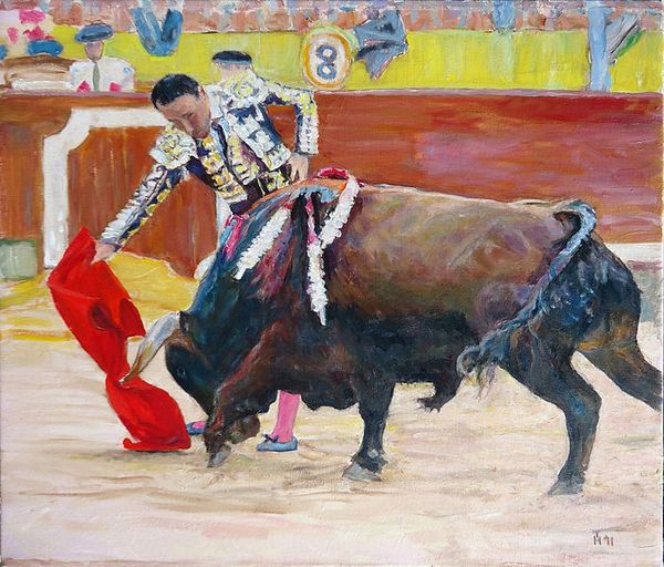Curator: We are looking at Eric Fischl's "Corrida in Ronda No. 1," an oil painting created in 2008. Fischl, known for his figurative work, often delves into themes of suburban angst and underlying tensions. This particular piece tackles the spectacle of bullfighting. Editor: My initial feeling? Discomfort. It’s stark, almost brutally so. The washed-out light adds to that sense of unease. The pink cape against the earthy tones—it's such a jarring contrast. Curator: Indeed. And beyond that initial shock, what we see here is a tradition steeped in hyper-masculinity and the subjugation of the natural world. It is critical to remember Spain's long colonial history in analyzing its traditions that deal in domination. What do you make of that sword piercing the bull’s back? Editor: Well, beyond the obvious... the violence… There’s a strange kind of… vulnerability? In both figures, actually. The bull is, well, obviously vulnerable. But the matador's posture suggests a weird delicacy, like he's both powerful and fragile. He isn't triumphant here; I feel as if he’s simply finishing something. I feel there's so much more at play with his pose. It's less about bravado, more like somber resignation. Curator: I find your point so true to form. Fischl’s style often blurs these lines, unsettling the viewer by forcing us to confront the power dynamics embedded in seemingly straightforward scenarios. Is the figure a victimizer? Why? This is very pertinent to Fischl's engagement in a #metoo scandal where these issues about power came to play. This event throws a particular shadow on this scene and its implied power structure, as a product of his imagination, don't you think? Editor: I get that feeling of queasiness about who exactly created the image—and who they are as people. Still, I see a beautiful painting here: but is the beauty in the bullfight... or Fischl's representation? Curator: Well, precisely, and art should push us to consider those questions even when they are extremely uncomfortable. Thanks so much! Editor: Yes, agreed. That's how art stays alive. Until next time.