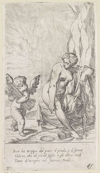 Editor: This is "Amor Carrying a bundle of Arrows to Fill His Quiver," by Odoardo Fialetti. It's a small etching from the 17th century. I’m struck by the contrast between the figures and the landscape. What stands out to you about it? Curator: Considering Fialetti's workshop, notice how the etching technique itself mimics the tools of labor and production. The lines become the means of replicating classical themes for a broader market. How does this small-scale print participate in the larger system of artistic consumption during that period? Editor: That's fascinating! So, it's not just the image, but the very act of making and distributing it that holds meaning. It's a commodity! Curator: Precisely. And the poem below reinforces this by linking the manufacturing of arrows to the labor of Vulcan. Editor: This print provides a new lens through which to understand the work's social life. Thanks!