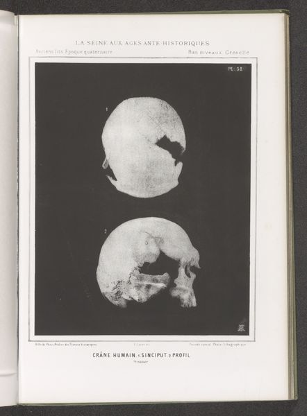 This print shows two views of a human skull, and was made by an anonymous artist using a photographic process. The choice of photography is significant. In the late 19th century, photography was emerging as a powerful tool for scientific documentation. Here, it is employed to objectively record and present archaeological findings. Photography allowed for a level of detail and accuracy previously unattainable through hand-drawn illustrations, revolutionizing the fields of science. The black and white medium emphasizes the stark reality of the subject matter. The contrast between the light bone and dark background enhances the texture and form of the skull. We can imagine the photographer carefully arranging the skull to capture these views, highlighting the scientific labor involved. The print represents a shift towards industrialized forms of image-making. It captures a moment in which the objective eye of the camera began to mediate our understanding of history, knowledge, and even mortality. Ultimately, the print serves as a reminder of the profound impact of technological advancements on visual culture.