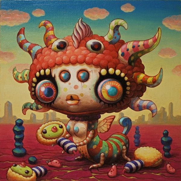 Yoko d'Holbachie's "Memory Keeper" is rendered in oil paint, a traditional medium, yet the product is anything but conventional. D'Holbachie creates a peculiar and whimsical figure, its anatomy a playful mashup of human and otherworldly elements. The smooth, deliberate application of paint gives the artwork a polished, almost surreal quality. But it's the meticulous detail that captivates. Each eyeball, polka dot, and stripe is carefully rendered, demanding time and patience from the artist. The level of control and detail suggests not just skill, but also a deep investment in the act of making, and that labor is central to the work's aesthetic impact. This challenges our typical notions of artmaking, where concept often overshadows execution. "Memory Keeper" reminds us that the act of creation, the labor of the artist, is integral to the artwork's meaning.