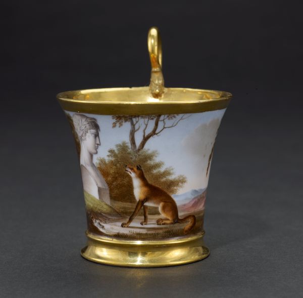 Curator: This exquisite cup is from a tea service for twelve, crafted between 1807 and 1808, and attributed to Christophe-Ferdinand Caron. It resides here at the Minneapolis Institute of Art. Editor: My initial reaction is one of serene elegance; the landscape encircling the cup evokes a quiet, almost melancholic beauty. Curator: The rococo style of this cup speaks to a period deeply concerned with elegance and luxury. Consider the porcelain itself; its manufacture required specific materials sourced from particular regions and involved skilled labor from the artists. The landscape decorations, carefully hand painted on the surface, transform a functional item into an art object. Editor: Absolutely. Placing this within its socio-historical moment, tea services weren't just about enjoying a beverage. Tea culture reflected social hierarchies, international trade networks involving colonial exploitation and class distinctions dictating access and enjoyment. Does the idyllic landscape soften these realities, presenting a sanitized vision of the world for the elite who used it? Curator: Interesting thought. On the surface, we see genre painting as decor but it certainly could be seen as a reflection, however subtle, of nature. Editor: Also, who would have owned this piece? What conversations unfolded around this tea service? This porcelain object holds a wealth of unspoken social dynamics. The seemingly pastoral scene, the heron wading peacefully, takes on new meaning when considered in this context. It reflects a carefully constructed vision of the world. Curator: Yes, understanding who made this is important too, particularly regarding artisanal practice. It challenges the historical dismissal of craft in favor of painting. In porcelain's creation we should observe what was the maker’s input. Editor: Precisely. And as a drinking vessel, consider also the role this cup played in ritual—who got to hold it? Whose lips touched the gilded edge? Even within a service for twelve, certain power dynamics were no doubt enacted around the sharing of tea from objects such as these. It is fascinating! Curator: Absolutely, fascinating! These items really embody production, material, and use and serve as a nice starting point for historical conversations!