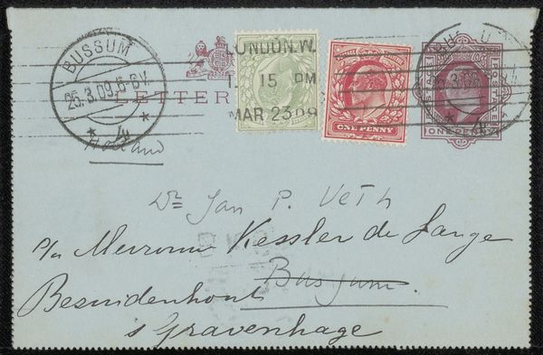 Editor: This is a postcard to Philip Zilcken, possibly from 1912, by Carel Nicolaas Storm van 's-Gravesande. It looks like ink on paper. What really strikes me is how much text there is – it almost overwhelms the image itself. What stands out to you in this piece? Curator: The fascinating aspect for me lies in the materiality of this object and the social context of its creation. Look at the various marks - handwriting, stamps, the printed details of the postcard itself. Each indicates a process of production, labor, and distribution. The handwriting itself is a physical manifestation of communication, of someone taking the time to craft a message. How does the material itself—cheap paper stock, perhaps?—impact its status as art versus ephemera? Editor: That’s an interesting point! It makes me consider the difference between a quick sketch and something intended to be a lasting artwork. Was this kind of postcard commonplace back then? Curator: Absolutely. The mass production of postcards in the early 20th century reflects changing patterns of consumption and communication. This wasn’t "high art," initially; it was a commodity, intended for widespread use. But now, as a historical artifact displayed in a museum, how has its perceived value shifted? Editor: I see what you mean. So, examining the materials and how it was made and used can tell us more about society and the artist's role in it? Curator: Precisely! We can think about the labor involved in each step, from manufacturing the card stock, the artist creating the original artwork (if any), to the postal workers handling and delivering it. Editor: That really makes me look at it in a new light. It's not just a pretty picture; it's a trace of many hands and processes. Thanks! Curator: Exactly. Thinking about the entire material and social process broadens our understanding and appreciation beyond just aesthetics.