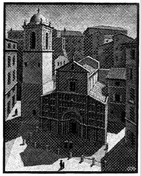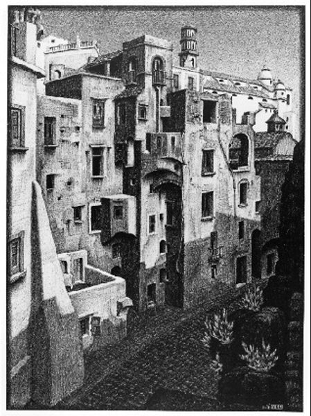 M.C. Escher made this print of a street in Scanno using a wood engraving. Look at the granular texture, where the marks aren't just lines, but tiny, insistent dots, creating a field of dark and light. It reminds me that artmaking is like a dance, a give-and-take between the artist and the material. Notice how he renders the light. The way it casts these strange geometric shadows. The shadows are shapes in themselves, solid things. I like the way the solid and void create rhythm. It’s a way of thinking about seeing, making you aware of how your eye pieces together the world. Escher’s work always felt a little like magic, or rather, like a thought experiment. It's the kind of image that sticks with you, urging you to question what you see, and how you see it. If you like this, you should check out some of the work of Piranesi - another master of light and shadow and the art of the possible!