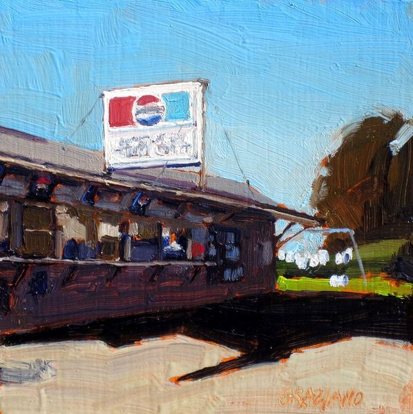 Dan Graziano painted "Street Food" in oils sometime after his birth in 1953, capturing a commonplace scene that speaks volumes about American urban life. The simple setting belies a complex network of social interactions and economic realities. The painting depicts a street food vendor, likely selling hot dogs or similar fare, under a bright yellow umbrella, an emblem of small business enterprise. The customer waiting in the foreground and the surrounding cars suggest a society on the go, where quick, affordable meals are essential. The location, probably in the United States, is defined by the street signs, utility poles, and style of vehicles. Consider the vendor’s role as a micro-entrepreneur, a figure celebrated in American culture, yet often facing economic precarity. This image touches on themes of labor, consumption, and the informal economy, reflecting the ever-changing landscape of work and leisure. To understand this work more fully, we could research the history of street food vending regulations, or explore the visual codes used to depict vendors in similar urban scenes.