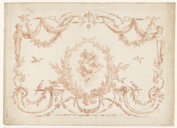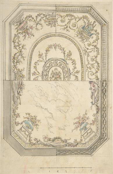 Curator: Here we have a drawing attributed to Jules-Edmond-Charles Lachaise, a "Design for a ceiling with ribbon bearing putti," made sometime between 1850 and 1900. It’s currently held at the Metropolitan Museum of Art. Editor: My first impression is one of lightness, almost ethereal. The color palette is subdued, fostering a sense of quiet elegance. I can see the ghost of forms hovering at the design's center, waiting for definition. Curator: The drawing exhibits a formal, almost academic, approach to ceiling design. The symmetry is meticulously observed, and the composition emphasizes balance and order. The framework comprises geometric precision with floral accents; classic Beaux-Arts. Editor: But isn’t the absence of a clear, finished central image speaking volumes? I can’t help but wonder about the context: who was this ceiling design intended for, and what kind of power or status were they hoping to project with this display of wealth and, frankly, outdated imagery of putti? What ideologies do they uphold, especially within the landscape of its creation in the latter half of the 19th century, amidst rising industrialism? Curator: I see your point, but the delicacy and technical skill should also be acknowledged. The precision evident in the ornamentation around the perimeter is remarkable, and even the suggestion of the putti showcases Lachaise’s skill in draftsmanship. I'm particularly interested in the function of these swirling linear accents against these angular planes to draw your eye inward toward the drawing's sketched figures. Editor: Sure, the technique is there, but how can we look past the elitism inherent in such ornamentation? Think about the social climate; these gilded cages were not available to many people—in contrast, how many impoverished populations can we estimate existed at this point? And what were the political dynamics related to that divide? This is an era of imperialism—what specific powers does this ceiling reflect? Curator: Those social commentaries are vital, certainly, but by focusing so heavily on exterior contexts, we run the risk of overlooking the more understated achievements that are embedded into the surface texture itself—like in these blended washes or balanced planes. This should be observed foremost as art; social meaning should always come after artistic intention and technical nuance. Editor: I contend that isolating the artwork from its social implications obscures a more holistic understanding. Seeing art this way, from an unbiased aesthetic perspective, upholds an exclusive academic authority instead of opening the viewing process as something participatory and accessible. We have to embrace a perspective that reveals context. Curator: I appreciate that outlook, seeing that this design can be read as emblematic of 19th-century attitudes toward class and power structures... Editor: Exactly! Understanding that helps contextualize the art historically and offers invaluable opportunities for interpretation beyond aesthetics alone.
