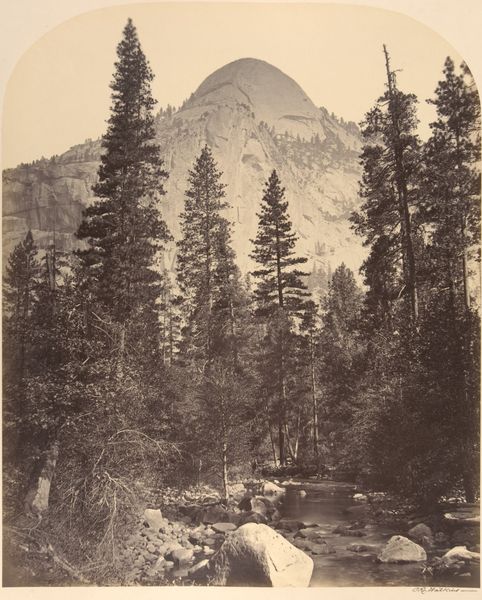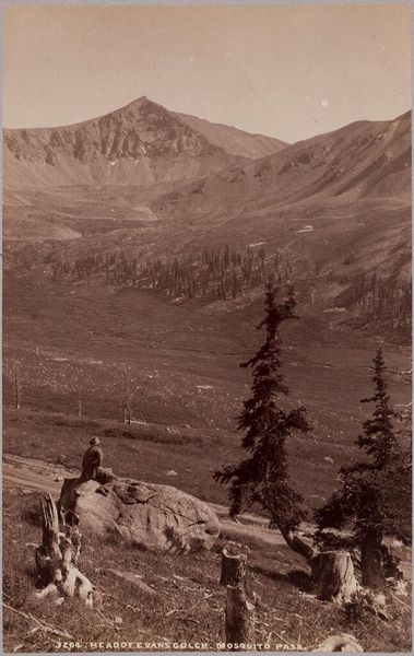 Editor: This photograph, "Torry's Peak" by William Henry Jackson, captures a sweeping mountain vista. It evokes a sense of awe, but also hints at the impact of human presence. What strikes you about this image? Curator: Jackson’s photographs were instrumental in shaping the popular perception of the American West. Consider that images like this circulated widely, fueling ideas about expansion and the "untouched" wilderness. How do you think these images influenced policy and settlement? Editor: So, it wasn't just about documenting, but also about promoting a specific narrative. It's interesting to consider the power that images held in shaping public opinion and ultimately, the landscape itself. Curator: Exactly. This photograph wasn’t just art; it was a tool in a larger cultural and political project. It leaves me wondering what the impact on indigenous populations was, as they were displaced.