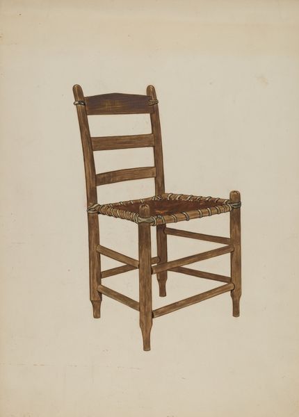 Editor: So this is Ernest A. Towers, Jr.’s "Corner Windsor Chair" from around 1939, rendered in pencil, charcoal and watercolor. There's something very direct and unassuming about this portrayal. What stands out to you? Curator: It is deceptively simple. A chair, yes, but a very specific one. The Windsor, rooted in a vernacular tradition, speaks volumes. Its design, born from practicality, gradually accrued symbolic weight as an object of colonial American identity and later, a nostalgic connection to pre-industrial craftsmanship. Think about the symbolism of home, hearth, comfort. What do you associate with this kind of chair? Editor: I think about New England, honestly. And maybe my grandmother’s house? But it’s interesting that something so plain can be so loaded. Curator: Precisely. The artist chooses not to depict a grand landscape or a portrait of power, but a chair. It implies a seated figure – absent, but present in our minds. Chairs carry an emotional resonance of those who occupied them, creating cultural memory. Have you ever thought about how furniture gains meaning over time? Editor: Not really. I guess I’ve always thought of still lifes as being about fruit or flowers, not...furniture. Curator: Consider the medium, too – watercolor and pencil, techniques often associated with sketching and documentation. This makes me consider if it was simply an exercise, or does this rendering speak to preserving a disappearing craft, a longing for a simpler time perhaps intensified by the impending World War? How does its form—solid and dependable—contrast with the delicate techniques of drawing and watercolor? Editor: That’s fascinating. I’m seeing so much more complexity in it now. I just thought it was…a nice drawing of a chair. Curator: Art often resides in these seemingly simple moments, in the everyday objects we imbue with memory and cultural significance.