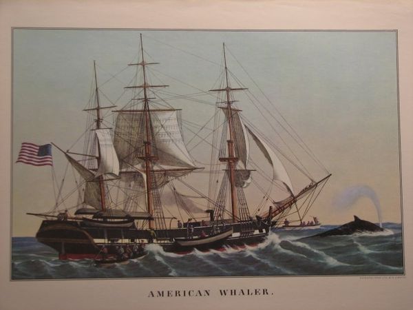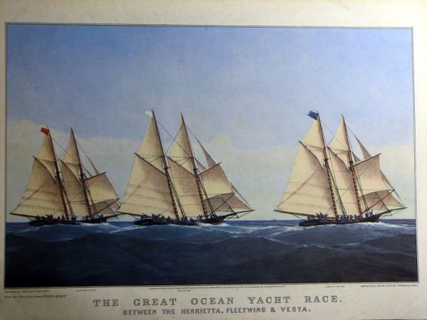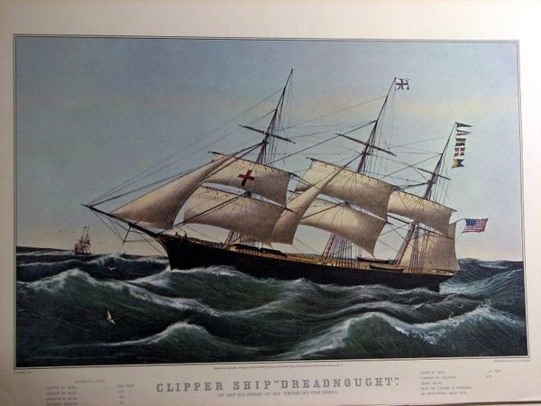 Curator: I find myself immediately drawn to the way the light reflects on the water's surface; there is a tangible weight to it. Editor: That’s an astute observation. The work before us, "The Miniature Ship Red, White, and Blue," is a lithograph created in 1866 by Currier and Ives, masters of mass-produced prints in 19th-century America. The materials themselves, the printing process—the layered inks and stones used—are all key to the feeling you are describing, aren’t they? Curator: Absolutely. Beyond the aesthetic, I wonder what a vessel such as this signifies within the context of post-Civil War America? Consider the romantic idealism embedded within such imagery—was it simply an innocent portrayal of maritime adventure? Editor: That’s what’s so compelling—diving into the societal currents that helped produce this artwork. One could argue that mass production and the consumption of these prints played a crucial role in shaping popular ideas of national identity in that era. These lithographs weren't meant for an elite audience; they reached a wide cross-section of American society. Curator: And the ship, what symbolic meaning would its presence have? It cuts through tumultuous waters with an unflappable certainty... Was the artist intending to express something regarding westward expansion, national progress, or Manifest Destiny? Editor: Think about how such prints were crafted, the labor, and the workshops where they came from, not only where but also who was doing the lithography? Curator: And what’s so moving about understanding the role and societal status these makers were bound to? The romantic brush strokes belie their very labor! Editor: It's a fascinating collision. This journey through process helps contextualize how maritime-themed imagery was integrated within the national ethos, shaping and reinforcing narratives of American ambition and identity. Curator: Truly! By looking through lenses of the artist, art worker, historical period, and present perception we better understand intersectional layers which define artistic canon. Editor: Precisely—the means of production, circulation, and consumption allows the viewer insight into social norms. Curator: Agreed! I'll never view this work the same way.