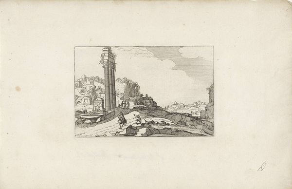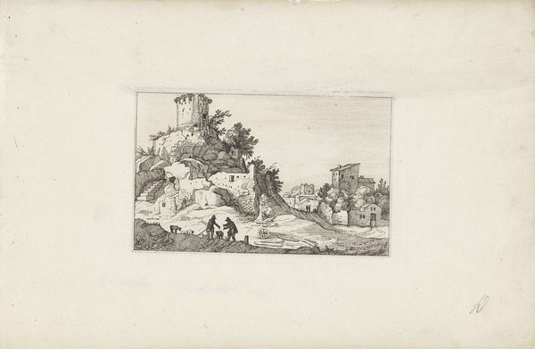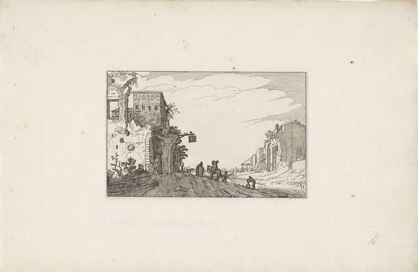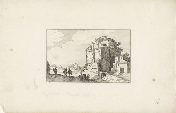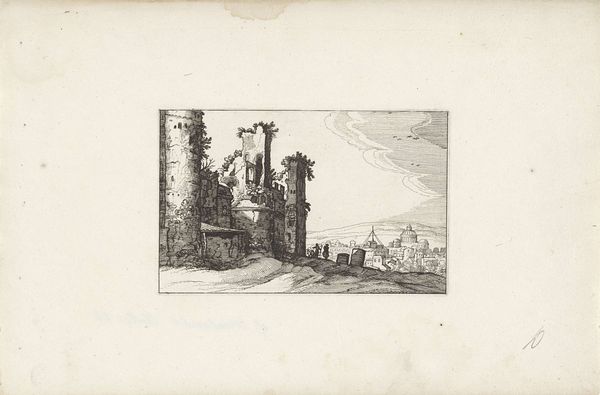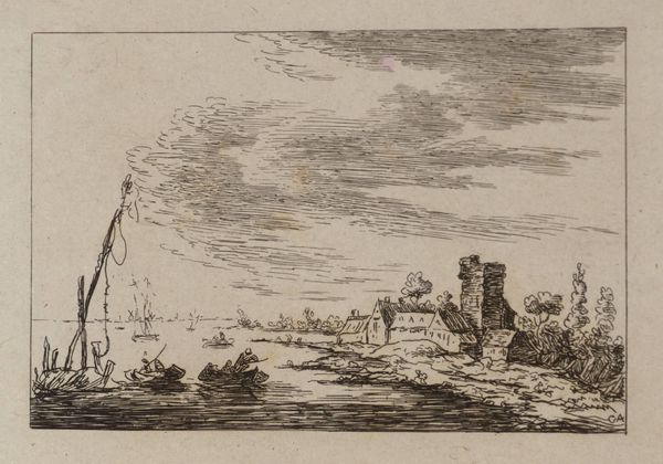 Curator: Okay, here we have Claes Jansz. Visscher’s "Toren en poort aan de kust", or "Tower and gate on the coast," an etching and engraving from 1618. What’s your initial take? Editor: Hmm, wistful. The lines are so delicate, almost fragile. There’s a dreamlike quality, like a memory of a place, not quite real, seen through a soft filter. Does that tower actually lead anywhere, or is it just there to make us ponder? Curator: I think that’s a beautiful observation. The structure does become almost symbolic. What Visscher’s done here is masterfully utilize linear perspective. Notice how the lines converge towards a vanishing point, creating an illusion of depth. Editor: Oh, absolutely! The way the clouds mimic the curves of the coast, and the positioning of the boats… it’s all subtly guiding our eye. But even with all this order, the tiny figures give it a storybook charm. I feel a longing to walk up to the tower door and just see where it goes. Curator: I can see that. The Dutch Golden Age really celebrated both grand landscapes and the intimate details of daily life. And if you think about it, prints like these made art accessible to a wider audience, allowing them to, in a way, "travel" through these scenes. Editor: Right! The printing press really put art into people's lives and homes. Visscher really nailed the ability of landscape to conjure mood. You can almost feel the sea breeze, filtered through his etching. I wonder, was he trying to capture an existing place, or construct an ideal one? Curator: The exact location is still debated, and the composition feels somewhat idealized. Whatever his intent, he captured something timeless about our relationship with the sea. Editor: It makes me want to chase that light, to step into that storybook world. Curator: For me, it highlights art’s ability to make any place and any time an occasion to travel, see the world in different perspectives. It’s an enduring echo through centuries.