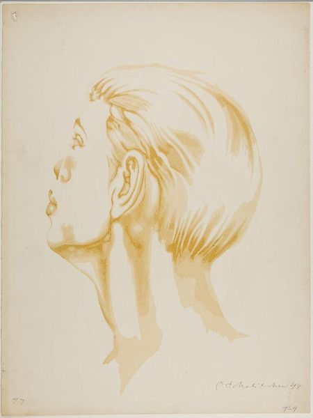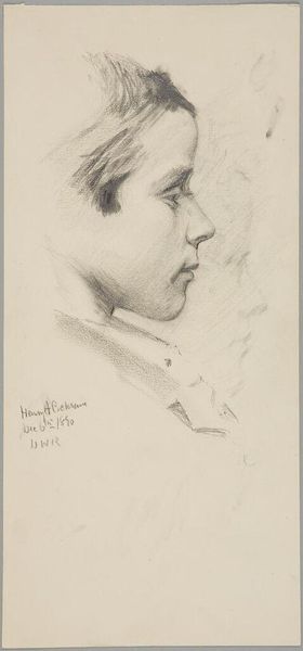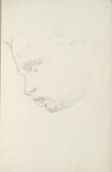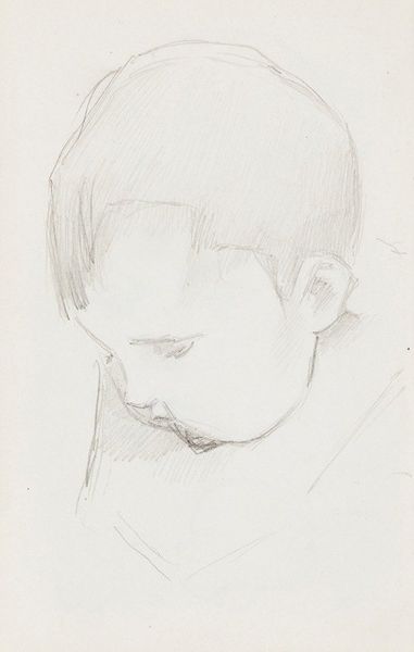 Curator: What a subtle drawing! It projects such quiet introspection. Editor: Indeed. We’re looking at “Mauritz Maexmontan, kasvot” by Helene Schjerfbeck, created between 1878 and 1879. It's a pencil drawing, a medium through which Schjerfbeck often captured striking portraits. Curator: The cross-hatching around the jaw and the ear is particularly effective. See how those denser concentrations of graphite define the planes of the face. Editor: The simplicity of the medium contrasts with the era’s artistic grandiosity. Schjerfbeck produced this while still a student, it’s thought. There's an immediacy to pencil, bypassing the complexities of painting to capture a more direct essence of the subject, even, perhaps, as a commentary on the nature of portraiture at the time. Curator: I'm fascinated by how she uses suggestion rather than explicit detail. The top of the head is merely implied. That incompleteness draws the eye into what *is* rendered—the nose, the lips, the gentle curve of the closed eye. Editor: Right. And consider how the paper itself contributes. The pale background becomes an active space, creating an almost dreamlike quality, as if we're observing a fleeting thought rather than a concrete individual. It also hints at the societal constraints women artists were under, often having less access to resources like paints. Curator: Agreed. The reduction encourages a concentrated contemplation of form. Look at the light playing across the bridge of his nose. Editor: There's also an incredible sense of vulnerability, especially knowing the time period it came from when portraying male sitters were seen to be objects of great national pride. The work quietly challenges these notions. Curator: It's a compelling study in understatement. This subtle choice reinforces a reflective, solitary mood, emphasizing the beauty in simplification. Editor: Absolutely. Looking back on it now, seeing this early piece through the lens of her later works and their context, this piece provides such a great framework into the themes she kept visiting.