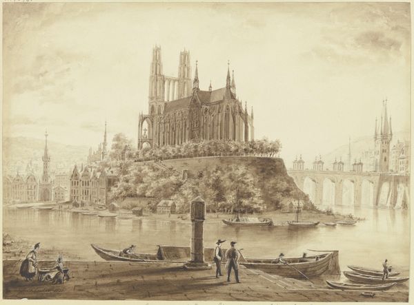 Editor: This is "The Grèves from the Summit of Mount St Michael," an engraving by Clarkson Stanfield. The detail is just incredible, it really captures the imposing nature of the architecture. What story do you think it's telling? Curator: Beyond the architectural grandeur, I see a narrative about power and faith intersecting with social control. Consider the historical function of Mount Saint Michael, both as a religious site and a strategic fortress. How do you think its imposing presence affected the lives of the people living in its shadow? Editor: I guess it would have been a constant reminder of both the church and the state's authority. Curator: Precisely. And Stanfield, though seemingly objective, participates in constructing that narrative. The viewpoint from above, the dominance of the architecture... it all speaks to a particular way of seeing and understanding the social hierarchy. Editor: So, it's not just a pretty picture, it's a statement about power? Curator: Absolutely! Art rarely exists in a vacuum. Examining its historical context reveals how it can reinforce or challenge prevailing social norms. Editor: That's a perspective I hadn't considered before. Thanks! Curator: My pleasure! It's about finding those threads connecting art, history, and society.