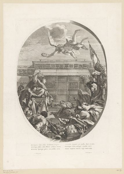 Jacques-Antoine Friquet de Vauroze created this print titled ‘Standvastigheid’ using etching. The composition is set within a circle, creating a contained visual field where various figures enact a scene of dramatic tension. A king sits enthroned, while a soldier stands before him. A body lies prostrate at the foot of the throne. The lines are finely etched, rendering details in costume, architecture, and facial expressions. Notice the spatial arrangement; the characters are placed on different levels. This creates a hierarchy of power and importance. The architectural elements such as the columns and throne, and the landscape backdrop are all arranged to draw the eye towards the king. The print invites us to think about how power is constructed and represented through visual means. The careful arrangement of figures and architectural details serves to reinforce a particular understanding of order and authority. It reminds us that artistic choices are rarely neutral; they reflect and shape cultural values.