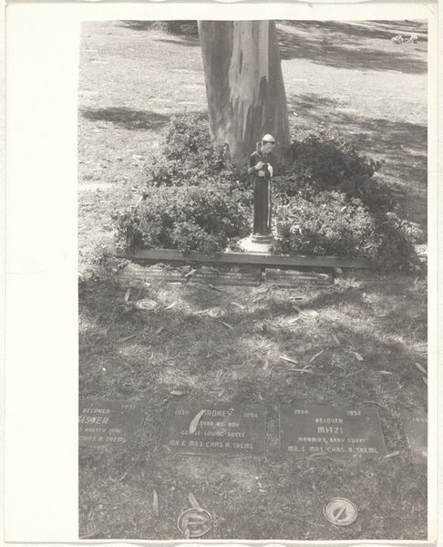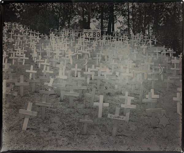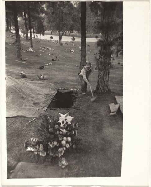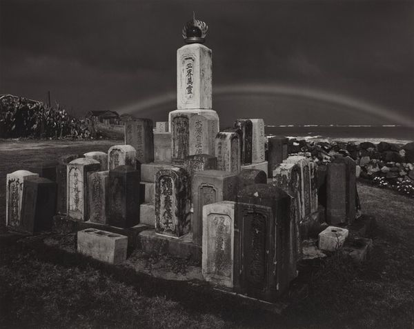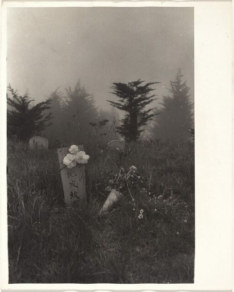 Editor: Robert Frank's 1956 photograph, "Cemetery--San Francisco," rendered in gelatin silver print, evokes such a quiet stillness. The headstones, adorned with flowers, create a very intimate, contemplative space. What strikes you about it? Curator: The headstones marked with what seems to be Chinese calligraphy draw my eye immediately, particularly set against the context of 1950s San Francisco. What stories are embedded in those symbols, hinting at cultural memory and the diasporic experience? Editor: I hadn't really considered the immigrant experience. Do you think that was something Frank was trying to convey? Curator: Perhaps. Frank was drawn to the margins, to the unspoken narratives within American society. Think about the symbolism inherent in cemeteries. They're liminal spaces, transition zones between life and death, remembrance and forgetting. These headstones, specifically, point towards a community maintaining its heritage within a new landscape. The objects placed on the gravesite act as offerings. Editor: That's such an insightful point. It transforms the reading from one of just solemnity to one of resilience, too. Are there other clues we might be missing about the emotional or cultural subtext? Curator: Consider the placement of the headstones, clustered yet individual, speaking to both communal bonds and individual identities. Look at the light, muted yet present, suggesting enduring hope despite loss. How does the composition invite you into that emotional space? Editor: Now I'm thinking about the language barrier as perhaps another form of marginalization that Frank seems to observe, using a visual vocabulary rather than a verbal one. I’ll never look at cemeteries the same way! Curator: Indeed. Photography, in Frank's hands, becomes a powerful language for unearthing layers of history, memory, and cultural identity. It is about uncovering collective memory, inviting a dialogue with the past.