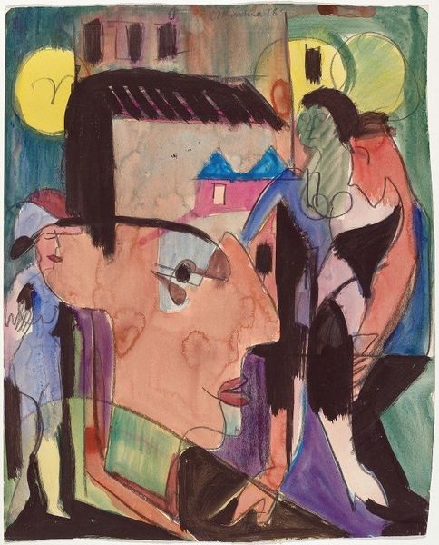 Editor: Here we have Ernst Ludwig Kirchner’s "Self-Portrait with Cat," held at the Harvard Art Museums. The striking color palette and elongated features give it a somewhat unsettling feel. What do you see in this piece? Curator: Kirchner’s self-portrait speaks volumes about the artist's place within a fractured society. His green skin, the cat, the interior setting—these aren’t just aesthetic choices. How do they relate to the rise of Expressionism and its critique of bourgeois values? Editor: So, it's about challenging those values through the visual language itself? Curator: Precisely. Consider the distortion of form and the jarring use of color. What cultural anxieties might these reflect, especially within the context of pre-war Germany? Editor: I see it as a deliberate act of rebellion against traditional representation. Thanks, that gives me a lot to consider. Curator: Indeed. Art serves as a powerful lens for understanding ourselves and our place within larger social narratives.