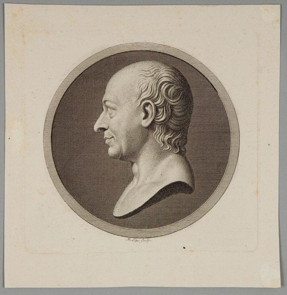 Editor: Here we have Antonio Perfetti's portrait of Antonio Canova. It's a profile, very classical, almost like a cameo. I find it strangely serene. What story do you think this portrait is trying to tell? Curator: It whispers of Neoclassical ideals, doesn’t it? Perfetti captures Canova's essence – the sharp intellect softened by a touch of romanticism. Canova, the sculptor, becomes the sculpture, immortalized by Perfetti's hand. It's not just a portrait, it’s a conversation between artists across time, don’t you think? Editor: I see what you mean, a conversation in portrait form. It's more dynamic now that you mention it. Curator: Exactly! It's a testament to Canova's enduring legacy, and Perfetti's skill in capturing it. Makes you wonder, what conversations will our art spark centuries from now?
