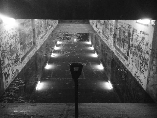 Editor: So, here we have "At Night," a photograph by Alfred Freddy Krupa, taken in 2018. The strong contrast between the darkness and that central illuminated staircase really draws the eye. It’s almost theatrical, but also quite eerie. What strikes you when you look at this piece? Curator: The first thing I notice is how Krupa manipulates the photographic process itself to create this "glowing" effect. We see the tangible evidence of photographic labor—the choices made about exposure time, the lens, and possibly even darkroom manipulation. Do you think this challenges the idea of photography as a purely objective record of reality? Editor: Definitely. It feels more like he’s painting with light rather than just capturing what's there. I’m wondering, do you think the stairs suggest a social commentary? Curator: It’s possible. Staircases have long been symbolic of social mobility, access, and even exclusion. In the context of a potentially Eastern European artist, thinking about labor and the built environment within a post-socialist framework might add a deeper layer to the photograph's meaning. How might these structures reflect historical power dynamics or shifts in urban planning? Editor: That's a perspective I hadn’t considered, especially relating it to that specific geographical and historical context. So, it's not just a pretty picture; it's a statement about accessibility and labor in a transforming world. Curator: Precisely. It encourages us to analyze not just what we see, but *how* it was made and *why*, forcing us to reckon with the social and material conditions embedded within a simple photographic print. Editor: I appreciate you pointing that out. It gives the photograph so much more weight and really prompts you to dig deeper into the layers of meaning.