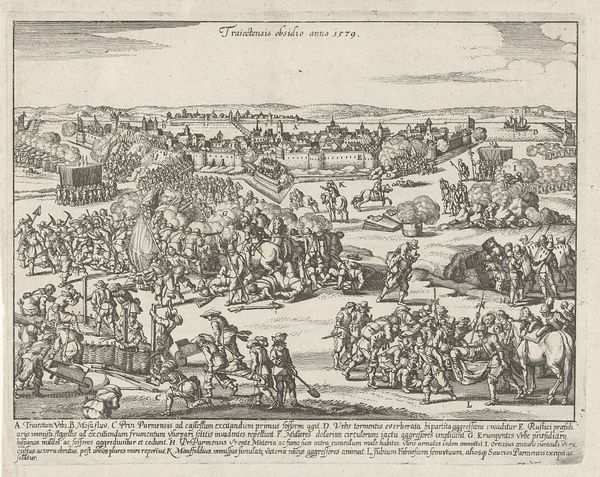 Curator: This intricate engraving, created sometime between 1649 and 1651, depicts the "Conquest of Tournai, 1581." While the artist remains anonymous, the print offers a detailed visual record of this historical event. Editor: My initial impression is chaos—a controlled chaos, meticulously rendered. The composition directs the eye from the smoke-filled siege at the city walls to the crowded foreground, a mass of bodies and horses. It’s quite dramatic, even considering it's a print. Curator: Indeed. And it’s important to consider printmaking in this era as a key mode of disseminating information. Engravings like this weren't just aesthetic objects; they served as visual news reports, shaping public understanding of events such as this conquest. Who commissioned it, who produced it and distributed it. Those are all interesting questions. Editor: True, though from a formal perspective, observe how the engraver used line variation to create depth and texture. The close hatching in the shadows of the horses creates volume and contrast that with the simple, thin lines that give detail to background. Curator: Furthermore, think about the socio-political context: the artist choosing to depict this particular event. Was it commissioned by a patron celebrating a victory, or perhaps by someone keen on reminding others about past conflicts? Who this print represents is also very important. It’s about controlling narratives. Editor: Right, I hadn’t thought of it like that before. And visually, it's a clear attempt to create a coherent narrative—observe the numbered annotations and the corresponding descriptions at the bottom. They function almost like captions, directing the viewer's interpretation. Curator: Exactly. Each numbered element—from the breaching of the walls to the mustering of troops—becomes a point of focus. It’s a meticulously crafted piece of propaganda using mass media technology to further certain ideas around warfare, legitimacy, and power. Editor: In closing, looking beyond the strict art-historical framing of this piece is also an avenue to more information—understanding the history surrounding the artist, even with this small print, it has some stories to tell. Curator: Absolutely, it’s in studying what that labor and craft produces where new narratives come forth. Thanks for sharing your take on this piece!
