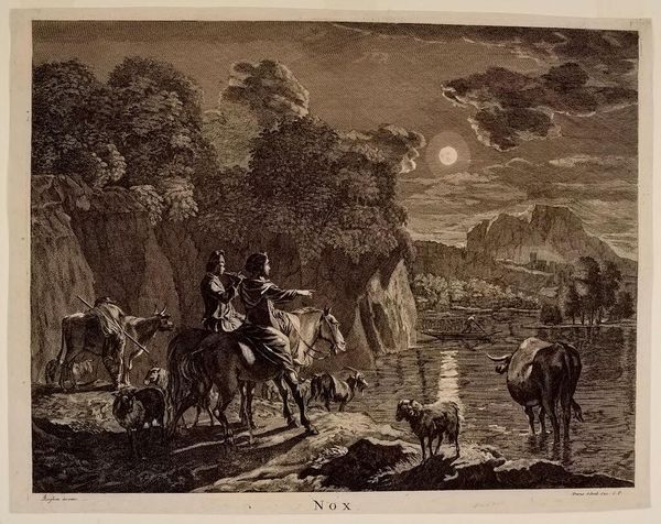 Editor: This is "Morning. Footbridge" by Dancker Danckerts. It's an etching, and I'm immediately struck by how the artist uses light and shadow to create depth. What compositional elements stand out to you? Curator: The formal arrangement is compelling. Note how the horizontal footbridge and the verticality of the trees create a grid, anchoring the pastoral scene. The varied textures—smooth water, rough bark—activate the surface. Editor: I see what you mean about the textures. The diagonal lines of the figures create dynamism against that grid. Curator: Precisely. And consider how the artist manipulates line weight to suggest perspective. Thicker lines in the foreground, finer lines receding into the distance. Editor: So, the composition isn't just pretty, it guides our eye through the scene using very specific artistic techniques. Curator: Indeed. It is a testament to how formal decisions shape our perception and understanding. Editor: I hadn't considered the perspective achieved through line weight alone. Thanks for pointing that out!