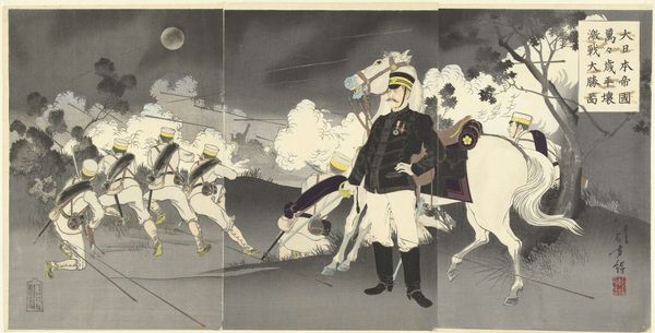 Curator: Look at this woodblock print titled "Captain Matsuzaki Bravely Fights at the Great Battle of Songhwan," created by Migita Toshihide in 1894. It depicts a scene from the Sino-Japanese War. Editor: It's striking! My initial impression is the dynamism. There’s so much movement, conveyed even through the chaos of what I presume is supposed to be the fog of war. The central figure on horseback dominates, almost floating above the turmoil. Curator: Indeed. The figure of Captain Matsuzaki is purposefully heroic. The artist utilizes familiar visual tropes of valor found in history painting. This was printed to serve a specific political purpose: to shape public perception of the war effort. Notice how he’s elevated, almost superhuman. Editor: Right, and the symbols reinforce that—the sword raised high, the powerful steed, even the explosions seem to frame him as this invincible force. How much of this heroic depiction reflected the reality of the war? Or do you think it's pure propaganda? Curator: Well, the reality of war is often far removed from such depictions. Prints like this served to generate patriotic fervor. There's a very distinct Orientalist framing at work, especially in how the artist chooses to render the conflict. I mean, ukiyo-e prints transitioned from depicting kabuki actors and courtesans to glorifying military campaigns, reflecting the evolving socio-political climate. Editor: The shift is quite stark, isn’t it? Moving from images that largely concerned entertainment and leisure to those steeped in nationalistic ambition. Looking at the colors—fiery oranges and yellows against muted greys—amplify that sense of conflict, almost an idealized battle as it filters into public memory. Even his horse looks otherworldly. Curator: Precisely! That red horse seems less like a war mount and more like a mythological Kirin or perhaps a dragon. These visual cues aren’t accidental; they draw upon a deeper well of cultural symbols. The scene becomes allegorical, turning Captain Matsuzaki into an archetype rather than an individual. Editor: I appreciate seeing the context and layers involved in what, at first glance, seemed to be a simple war depiction. It’s a potent reminder of the complexities embedded within seemingly straightforward historical narratives. Curator: And for me, thinking about cultural memory and its continuity in the face of something so traumatic helps me reflect on art’s potential to both glorify and offer catharsis.