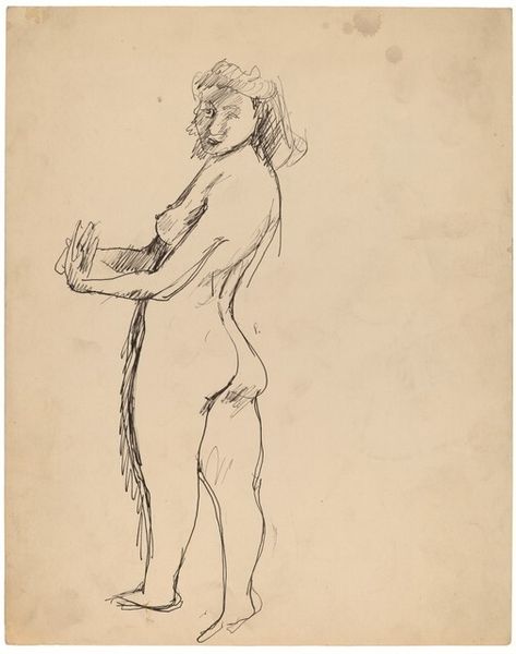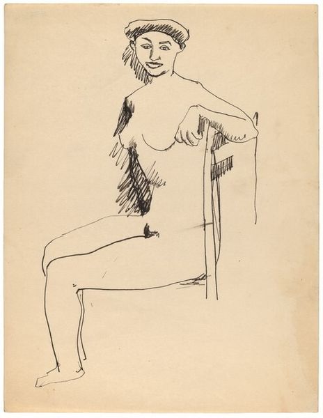 Editor: This is a pen and ink drawing entitled "Nude Sideways on a Chair, Right Leg Extended to Ground." It's attributed to Mark Rothko, though undated. The quick, gestural lines give it a very immediate feel, almost like a sketch from life. I'm struck by the direct gaze of the subject. What's your take on this work? Curator: It's fascinating to see Rothko exploring figuration, given his later embrace of pure abstraction. Historically, academic figure drawing served as a foundation for artists, grounding them in observation before venturing into more subjective realms. Notice how even in these spare lines, we see an echo of the classical nude – an image thoroughly loaded with centuries of artistic and social power. Editor: Do you think the historical context of the nude impacts how we see this specific drawing? Curator: Absolutely. Rothko would have been keenly aware of the loaded history. He's playing with a trope – the reclining nude – while simultaneously stripping it down to its barest essentials. This act in itself speaks to the sociopolitical atmosphere of his time, a period of deconstruction. One might read it as a challenge to traditional notions of beauty, of the objectified female form. How do you interpret the sitter's gaze within this framework? Editor: It feels assertive, less passive than the traditional reclining nude. More present and challenging the viewer. Curator: Precisely. Consider how the drawing, its existence, and the venue we’re seeing it in - a museum, a place with institutional authority- work together to construct a cultural understanding. We have this simple sketch, imbued with meaning through its place within historical narratives and our own contemporary perspectives. Editor: It really brings the nude into our present. I didn't realize the art world and its institutions played such a central role in framing even something as simple as this drawing. Curator: Exactly. Art never exists in a vacuum; its meaning is always co-created by its context.