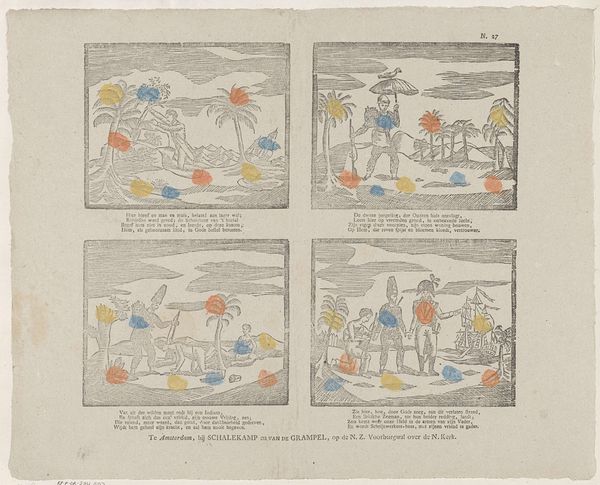 This print, titled "Kunsten op paarden", was produced by Mindermann & Co. in Amsterdam. The composition is neatly divided into four squares, each depicting a different equestrian scene. The limited use of line and the almost diagrammatic representation of the figures create a sense of distance. The print’s structure invites a semiotic reading, where each panel can be seen as a signifier. For instance, one panel shows figures in classical garb atop horses, which might evoke historical or mythological narratives. Another panel, with a figure performing acrobatics, could signify skill and control. The structure and arrangement of the print invites interpretation through the cultural codes of spectacle and horsemanship. The division into quadrants creates a formal structure, but it also questions fixed meanings. Each scene presents a different facet of horsemanship, and challenges a singular, unified meaning.