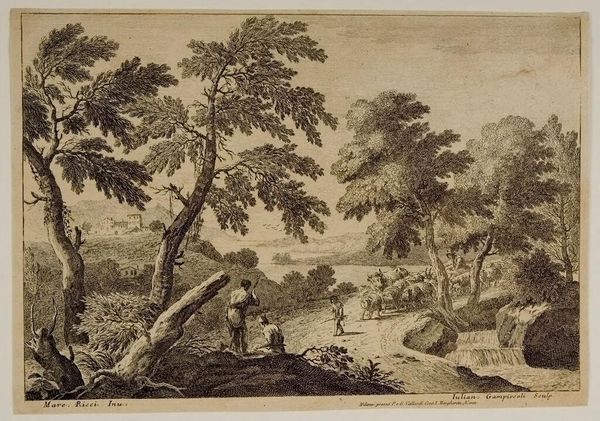 Curator: Anton Kölbl's etching, “Wood Choppers,” presents a landscape scene dominated by dense foliage and a subdued palette. Editor: It certainly evokes a sense of somber introspection. The tight cross-hatching and muted tones give the entire composition a feeling of heavy stillness. Curator: Observe the artist's use of line and texture to create depth and volume. The density of the trees contrasts with the open sky, creating a dynamic interplay of light and shadow. Editor: Yes, but beyond the formal elements, consider the cultural implications. Wood choppers historically symbolize both provision and destruction. They are figures of transformation. Curator: A compelling point. Yet, I'm drawn to the way Kölbl manipulates the materiality of the etching itself to create such a striking composition. Editor: It's fascinating how a simple scene can hold such complex cultural weight. Food for thought. Curator: Indeed, a testament to the power of artistic vision and masterful technique.