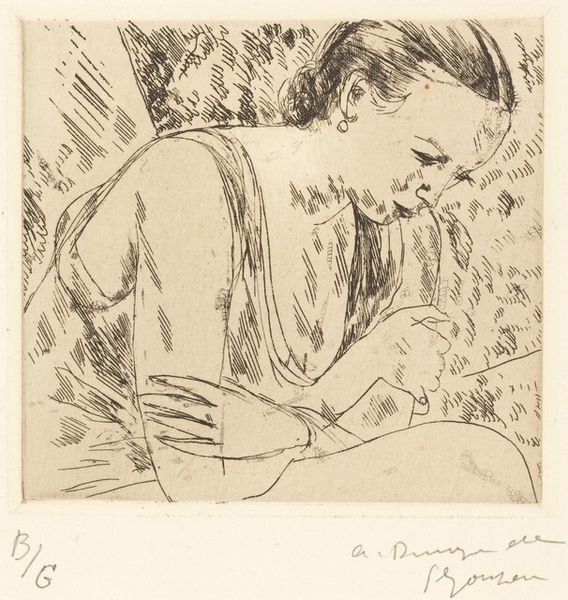 Andre Dunoyer de Segonzac made this etching called ‘Fernande with Arms Crossed, Small Plate’, sometime in the early 20th century. It’s all about line, isn’t it? The kind of line that feels its way around the form, almost tentatively. Look at the way he defines her face. It’s not about filling in the details but suggesting them with these delicate, almost hesitant strokes. And then there's the background. It feels like a collection of scribbles, a kind of shorthand for the world around her. It's like he's saying, "I don't need to spell everything out for you; you can fill in the blanks." This reminds me of Matisse, who was also interested in the power of the simple line. Both artists show us how much can be said with so little, and how sometimes, it's what's left unsaid that speaks the loudest.
