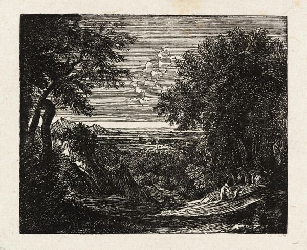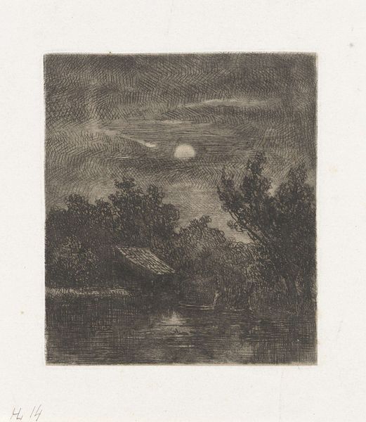 Curator: Samuel Palmer created this drawing entitled 'The Harvest Moon. Drawing for ‘A Pastoral Scene’ in 1832, using ink and charcoal on paper. Editor: The mood is so incredibly still, almost dreamlike. The sky dominates, but the details in the landscape suggest something quietly unfolding there. Curator: Indeed. Palmer's fascination with the landscape can be viewed through the lens of Romanticism and its idealization of nature, but I see in this work also an examination of agrarian labor, class structure and community during the economic transformations of the early 19th century. The figures are small, almost engulfed by the natural world. Editor: I see it, and that engulfment speaks to themes that resonate today about power, land ownership and labor exploitation. The moon could also be seen as representing forces beyond human control that shape the characters and dictate life in these remote areas. I mean, where are these figures situated historically? Curator: Palmer spent significant time in Shoreham, Kent during this period, and this work seems rooted in his observations and reflections during this time living away from London's industrialized backdrop. But I can't look at this idyllic composition without also acknowledging the history of the landscape in relation to land enclosure acts that dramatically shifted access to land in England. These events led to massive rural depopulation as common land became private, forcing rural laborers to seek work in factories, something not touched upon in this work but deeply affecting the life chances of rural laborers at this time. Editor: It almost forces you to question the picturesque idyll of pastoral art doesn’t it? The silhouetted figures appear like cogs in an unseen system of labor, caught within something that impacts them deeply and personally but that they can only partly shape. The high contrast of the moon draws your eye, giving a surreal edge. Curator: Absolutely. Palmer complicates the idealized vision of the countryside through sharp and often obscured tonality to signal that life on the margins for farm laborers was far from that romantic depiction. Editor: Examining works like these highlights the social and cultural complexities interwoven within the landscape genre. It calls us to question narratives and power structures present and to use historical perspectives when we seek meaning from them. Curator: By interrogating visual representation from a critical standpoint, we expand and refine our perspective of the world. This will shape our thinking towards fairer ones for our world today.