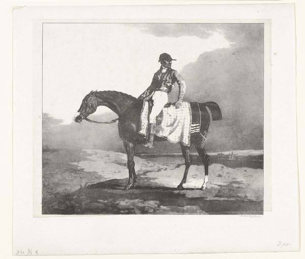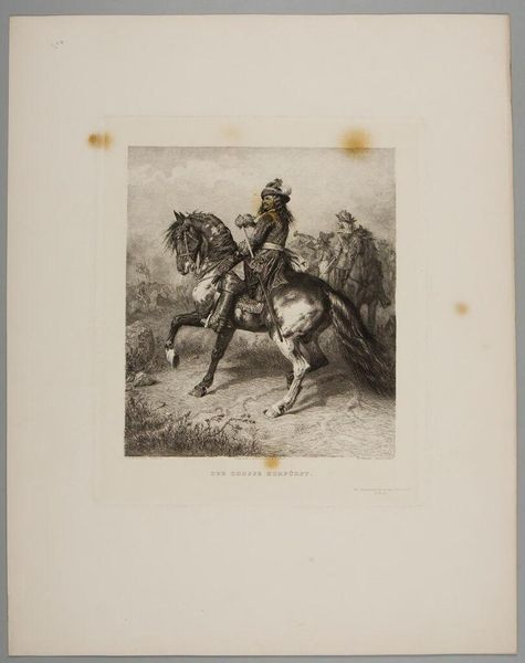 Editor: This is "Huzaar te paard, een charge uitvoerend, met een pistool in zijn hand" by Joannes Bemme, likely made sometime between 1800 and 1841. It’s an engraving and etching on paper, depicting a mounted soldier charging into action. I'm struck by the soldier's intense forward motion, emphasized by the landscape’s emptiness. What historical narratives do you think this work speaks to? Curator: Well, considering the period and subject matter, we can view this print through the lens of evolving military identities and the romanticized image of warfare that was becoming increasingly popular. This idealized image of the Hussar contrasts with the brutal realities of the Napoleonic Wars happening around that time. This image seems geared to creating popular support. Editor: Creating support through imagery, how so? Curator: Note how the artist presents the soldier. Is he weary, injured, or in a ragged uniform? No, Bemme meticulously renders him as heroic and almost theatrical. The print could be seen as part of a broader effort to cultivate patriotism, promote military service, and justify political actions of the period. How do you see it connecting to the tradition of history painting? Editor: It strikes me that this historical painting, in print form, made the glory of battle more accessible to a wider audience beyond the wealthy elite who typically commissioned paintings. The print transforms history into a relatable and reproducible commodity, circulating its message further. Curator: Precisely! And who benefits from this romanticized image? Does this image serve all of society, or only a segment? Considering such factors can challenge traditional art historical narratives. Editor: It definitely seems designed to elicit a specific emotional response, potentially obscuring the harsh realities of war. Thinking about its circulation really adds a layer of social complexity that I hadn't considered before. Thank you! Curator: It's fascinating to see how artistic choices intersect with broader socio-political strategies, isn't it? It prompts you to consider who controls those narratives and why.