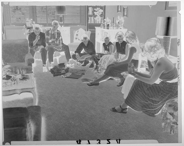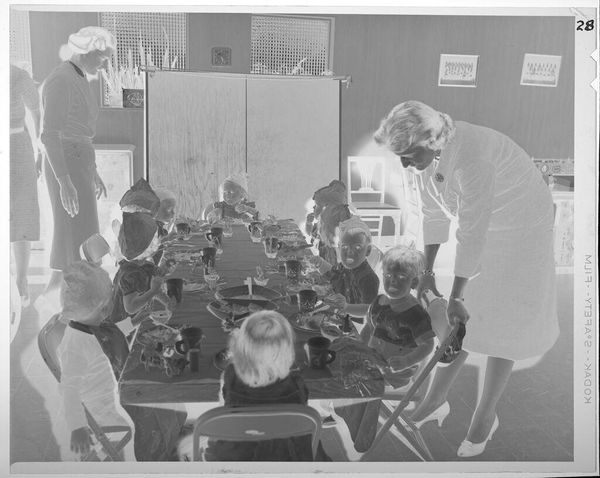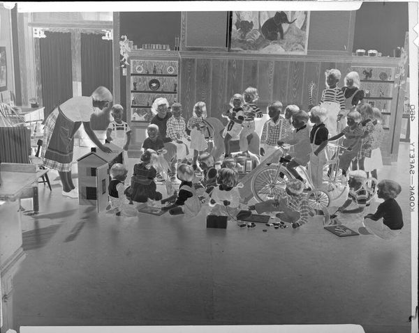Curator: This photograph, captured by John Howell, shows children listening to a story in their classroom. There's something so captivating about its simplicity. Editor: Yes, a quiet moment, wouldn't you say? The children are arranged so neatly, almost like an audience, all eyes focused on the storyteller. Curator: The blackboard drawing of the giraffe and elephant, coupled with the piano, evokes a sense of learning, growth and the simple symbolic imagery of childhood. Editor: It is interesting how the images of the animals on the board hint at the stories they could be listening to. Images act as a conduit to memory, imagination, or shared history, it is compelling. Curator: Absolutely, there's a social context here, too. Classrooms and the shared experience of learning are powerful cultural symbols in themselves. Editor: Indeed. And the photograph captures a unique atmosphere, an exchange between generations. Curator: So true. It invites us to reflect on our own formative experiences. Editor: I agree, an intimate look into the past with timeless symbols.