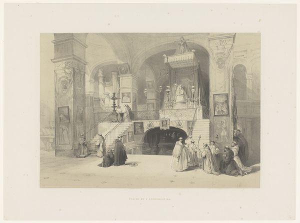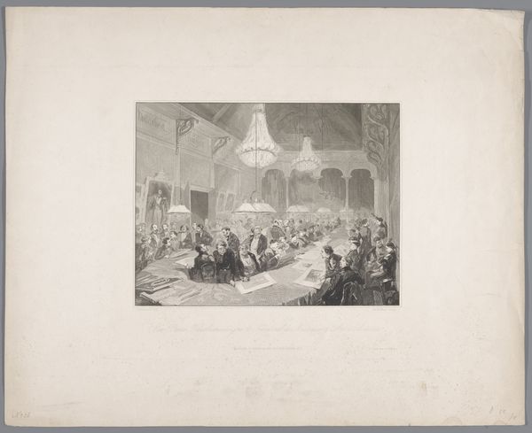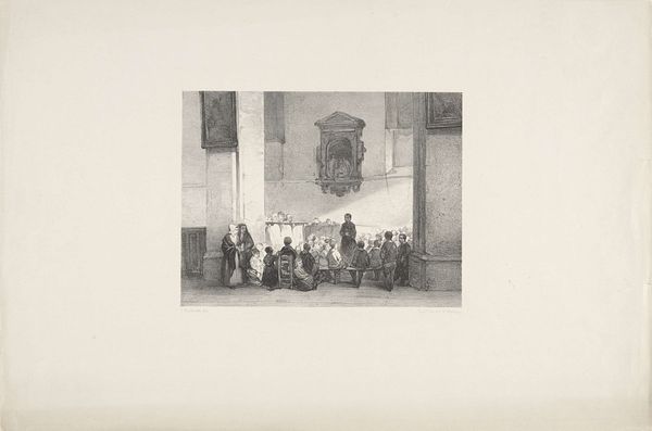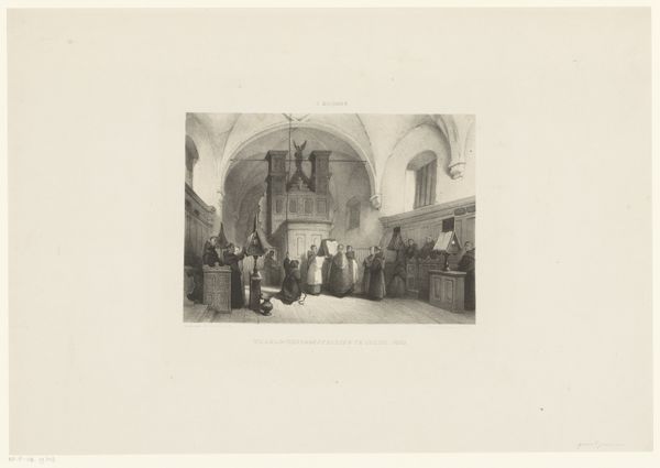 Curator: Charles Rochussen's "Voorbereidingen voor een feest," an etching dating from before 1846. What springs to mind when you observe it? Editor: Pure bustling anticipation! The flurry of activity, the theatrical stage being constructed… it all sings of an impending joyful eruption. You can almost hear the tuning of instruments and the rising chatter of a crowd. Curator: The composition skillfully guides our gaze. The convergence of lines toward the center stage creates a focal point amidst the chaotic energy. Note Rochussen's use of light and shadow to delineate forms and add depth. It’s more than just illustration; it's the construction of visual architecture. Editor: And within that architecture, what a human comedy unfolds. The monks chatting while a performer rehearses—everyone caught up in their little world. And look at the almost caricatured figures. It reminds me a bit of Hogarth, but with a Dutch restraint. There is commentary here, about hierarchy perhaps? Curator: Intriguing suggestion. Considering this etching originates within the Romanticism movement, might this arrangement point toward a yearning for an idyllic community, or a veiled critique of emerging bourgeois values, even class distinctions, that Romanticism often explores? Editor: Ooh, interesting… Yes, that fits well with what I felt but didn't fully articulate! The city as a theatre of human folly, gilded with fleeting moments of camaraderie before social divisions reassert themselves. Is it cynical, or simply observant? Curator: Its strength lies in its open-ended nature. We observe the layers –literal, symbolic, material– and derive our interpretations. Rochussen presents not a polemic, but a visual record pregnant with the complexity of 19th-century social dynamics. Editor: Exactly! It invites you to play detective. To peel back the layers and find not answers necessarily, but a richer set of questions. That, to me, is what makes it resonate, centuries later. It speaks of fleeting gatherings, then as much as it speaks of today.