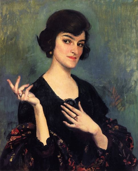Editor: We're looking at "Portrait Of An Elegant Lady," an oil painting by Albert Lynch. There isn’t a specific date attributed to the work. The woman's gaze is captivating; there’s almost a knowing sadness in her eyes. What symbols or ideas jump out at you when you first see this? Curator: The painting acts as a portal, doesn't it? To an era where women's portraits weren't merely representations but were curated projections of identity. The fur stole, the hat, they speak of a deliberate construction, an armour almost. Look at how the golden hat clasp anchors the composition, almost like a heraldic crest. What stories might that symbol be silently narrating? Editor: That's fascinating! It’s like she’s concealing something, yet also wanting to be seen. I hadn’t considered the "armour" aspect of the fur stole. Is this about societal expectations and maybe a subtle rebellion against them? Curator: Exactly! The lady’s attire represents external status, but it is her gaze that cuts through all the layers. Her slight, almost imperceptible smile contradicts the overt seriousness and opulence around her, does it not? Almost as though a hidden language exists only between her and us. Do you sense a dialogue here between the superficial and the deeply personal? Editor: Definitely, now that you point it out. It's much more complex than just a pretty portrait. Thanks for showing me how to look deeper! Curator: Indeed, and perhaps that is its silent power - it allows us to consider our relationship to imagery and decode the secrets woven into what appears, initially, so straightforward.