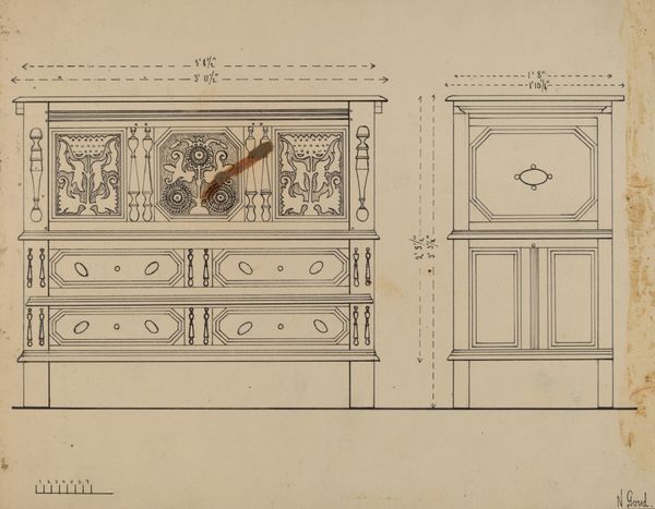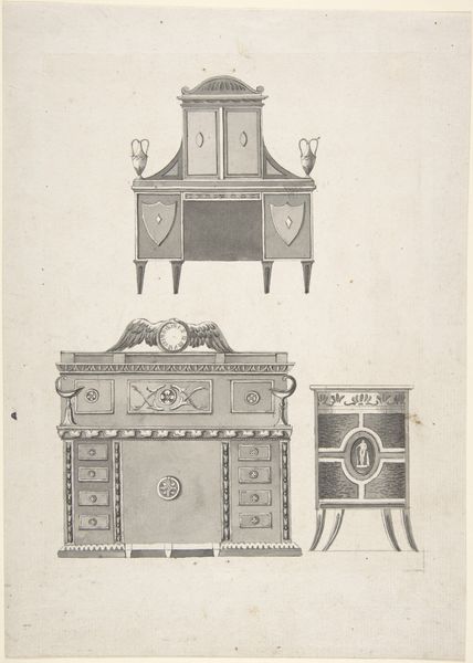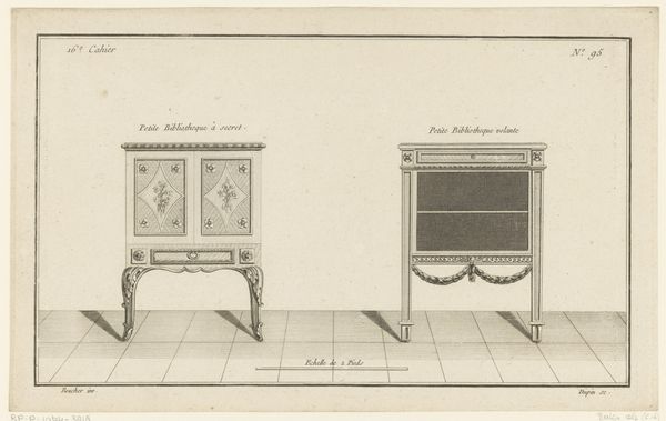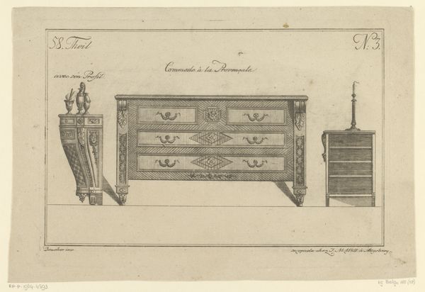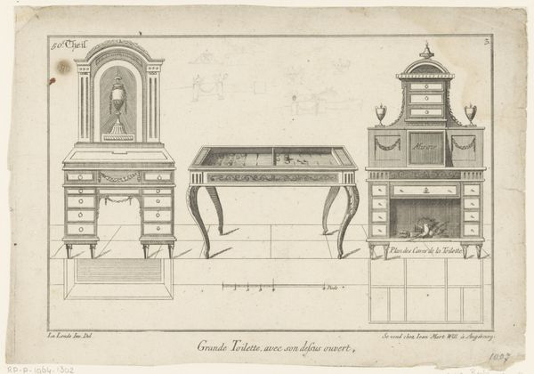 Johann Carl Schleich made this print of a music table and cabinet with etching around the late 18th or early 19th century. It's a technical drawing, representing the design for an elegant piece of furniture, probably intended for a well-to-do household. This kind of print belongs to a larger culture of design and manufacture, where specialized knowledge was shared through academies, workshops, and publications. It emerged in Europe, where the culture of mercantilism was rising. The Dutch Republic in particular, where Schleich was working, was an important center of trade and craftsmanship. The drawing reflects a society where music and refined objects were becoming increasingly accessible as signs of status. Such drawings help us understand not just the object itself, but the whole system of production and consumption that it embodies. They offer a peek into the world of skilled artisans and wealthy patrons, and the social hierarchies of the time. Looking at resources such as trade records, design manuals, and even household inventories help further illuminate the context for this print.