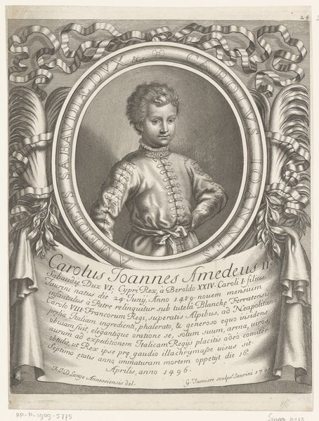 Curator: Take a moment to observe this Baroque engraving from 1702, titled "Portret van Amadeus VI van Savoye", created by Pierre François Giffart. The artwork, currently housed in the Rijksmuseum, meticulously depicts Amadeus VI. What's your first impression? Editor: The contrast is really striking. The sharp lines of the engraving create a rather stark portrait, particularly against the softer details of the hair and clothing. It feels incredibly formal, even severe, but with flourishes. Curator: Giffart's process emphasizes line engraving, a technique involving cutting lines into a metal plate to hold ink, resulting in those distinctive, crisp lines you noticed. It was a very labor-intensive printing process, requiring skilled artisans, which gives us insight into print production of that era and the relative expense of image reproduction. Consider the engraver’s labor. Editor: Absolutely. You can almost feel the tool scoring the plate. The texture seems important; observe how the lines vary in density to create shading and form. It's all about surface and the distribution of dark and light areas, rather than color, isn't it? The eye is drawn to areas of high contrast. Curator: Exactly. Look at how the inscription at the bottom interacts with the portrait itself. It places Amadeus within a historical and societal context. It isn’t just an image of a nobleman. Editor: That cartouche provides such an anchor, a clear indication of subject and status, but I almost feel the ornamentations distract from it. The ribbons and flourishes frame it. Also, I keep returning to the armor, its reflection indicating both status and… confinement. Curator: Indeed. These symbols of wealth and power are central to Baroque portraiture. They helped to reinforce and communicate societal values and the subject’s role within them. Editor: It is hard not to see, in the end, the piece as a document, its meaning bound up in what it chooses to highlight and leave out. Curator: Precisely. By examining Giffart’s methods, materials, and subject within his contemporary world, we see more than just an old portrait; we understand how identities and messages were constructed. Editor: And through analysis of line, tone and composition, we unravel its intricate design, gaining insights into how the artwork signifies wealth, power and status.