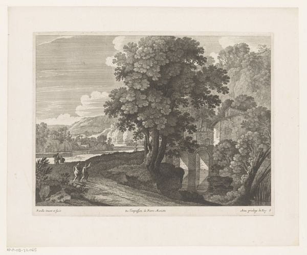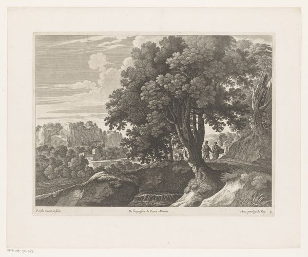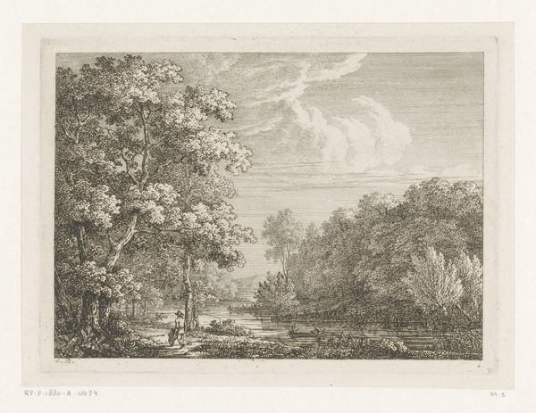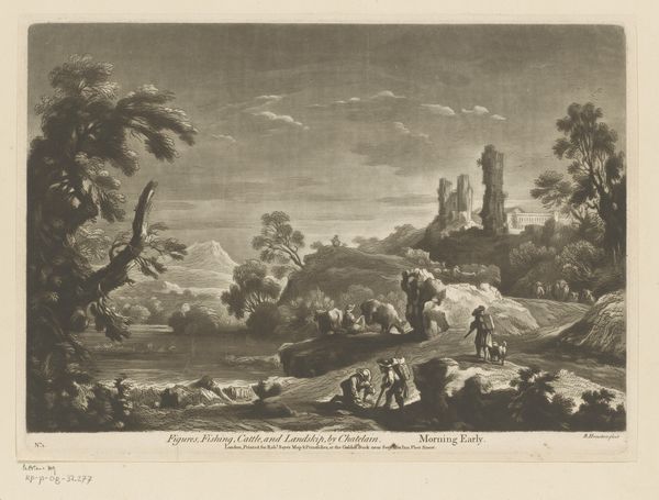 Editor: So, here we have Richard Houston’s "Landscape with Waterfall," an etching and engraving dating from between 1745 and 1794. It strikes me as a somewhat theatrical depiction of nature. Almost like a stage set. What are your initial impressions? Curator: Theatrical, yes, absolutely. Think about the 18th century's obsession with the 'picturesque'. They're not just representing a waterfall; they're staging an encounter with untamed nature, isn't it? It’s as if they were almost shaping nature through this artistic process, arranging trees and streams into a harmonious composition, while being 'awe-struck' by their artifice. I almost wonder: is that tower ruin in the background even there, or is it part of the constructed ‘picturesque’ view, a borrowed element from a romantic painting? Editor: That's fascinating. So, it's not necessarily about accurate representation, but about creating a specific feeling? Curator: Precisely! What kind of a feeling do *you* think it's conjuring up? Is it sublime, or maybe just a carefully curated spectacle? What does the inclusion of people bathing suggest about our place in the nature around us? Editor: Well, the bathing figures add a touch of whimsy. Maybe it speaks to humanity’s relationship with the natural world, like we’re meant to be a part of this scene, not just observers. Curator: Exactly. The piece operates in that tension, the pull between our control over the view, and our desire to belong to it. Perhaps, in our own era of digital manipulations, and environmental anxieties, this resonates differently for each of us. I learned a lot thinking with you on that point. Editor: Me too! I'll definitely look at 18th-century landscapes with fresh eyes now. Thank you for sharing your perspective!