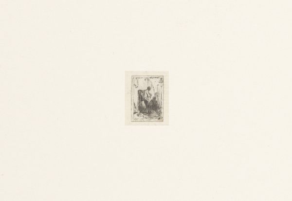 Curator: We are looking at "Voddenraper," an etching created by Charles Jacque in 1843. My first impression is its somber tone, that heavy sack the figure is carrying looks arduous. Editor: Indeed. The figure, presumably the "voddenraper"—rag picker—is shown bent under the weight, but the piece itself invites us to consider broader systems of exploitation and class disparity that determined daily existence for many during this period. Curator: It is an etching, and Jacque uses this print medium in a way that almost romanticizes labor. Though there is undoubtedly a sense of hardship conveyed, the technique itself feels delicate. I wonder what choices underpinned the representation of someone experiencing poverty and to what audience these etchings circulated. Editor: Well, Jacque was aligned with the Realist movement, aiming to depict everyday life authentically. The etching as a medium made art accessible, moving away from the elite patronage systems and exposing audiences to the lives of urban laborers. But whose gaze are we seeing? Are we invited to empathize, or are we observing the "other"? Curator: It brings up interesting questions regarding representation and the artist’s intent. This piece forces us to think about visibility of labor—whose work is valued, whose isn't, and how art plays into perpetuating or challenging those ideas. Were such works intentionally meant to prompt critical reflections? Editor: I think so, or at least contribute to a dialogue. Genre scenes such as this offer a lens through which we can understand social conditions and spark reflection on inequalities then and now. By engaging with artwork like this, perhaps we might reimagine labor in ways that push for fair pay, decent conditions, and the acknowledgement of our interconnectedness. Curator: Thank you for the way you illuminate social history, highlighting not just what’s depicted but the political implications, particularly the social structures at play within the art world. Editor: It has been a pleasure, your sensitivity toward both art history and today is appreciated.