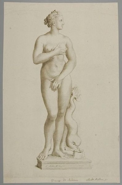 Curator: This drawing from the Tate Collections is by Prince Hoare, who lived from 1755 to 1834. Its title is not known, and it depicts a standing nude female figure rendered in graphite on a paper support measuring 368 by 233 millimeters. Editor: The pose, with the hands covering the breasts and groin, speaks of a kind of enforced modesty, a societal imposition on the female form. What does it mean to depict nudity yet simultaneously conceal it? Curator: From a materialist perspective, the use of graphite allows for a subtle modulation of light and shadow. This technique softens the figure and also shows the artist’s familiarity with classical ideals. Editor: The absence of a title also feels significant, reducing the figure to an anonymous representation of idealized femininity devoid of individual agency. It reveals how art can perpetuate gendered power dynamics. Curator: But the very act of drawing, of selecting and presenting this image, provides information about the production, patronage, and cultural consumption of art in Hoare's time. Editor: Ultimately, this drawing forces us to confront the history of the male gaze and the ways in which art has been used to objectify and control women's bodies. Curator: It is a fascinating example of how materials and methods can create both aesthetic beauty and reveal historical context. Editor: Yes, a stark reminder of the power and responsibilities inherent in representation.