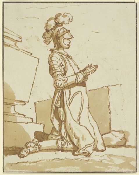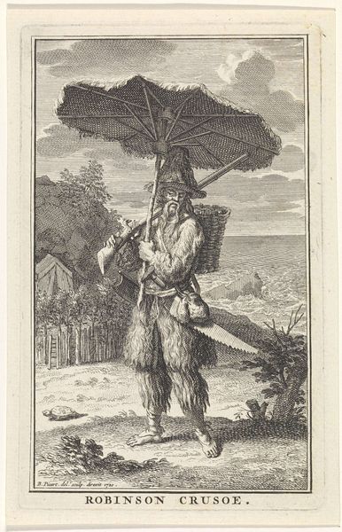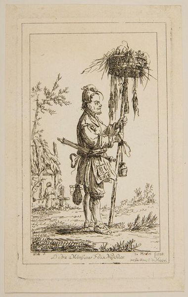 This etching, "Woman with baskets on her back", was made by Otto Baron Howen, likely in the Netherlands during the late 18th or early 19th century. The image presents a woman burdened with two large baskets, suggesting the labor and perhaps the lower social standing of the figure. The composition might speak to the economic structures of the time, where manual labor was a common fate, particularly for women. Howen, as a Baron, likely occupied a privileged position within this society. The Rijksmuseum, where this piece is housed, plays a key role in shaping how we view Dutch history and culture. By exhibiting this work, the museum invites us to consider the lives of ordinary people alongside more celebrated historical figures. To fully understand this image, we might delve into records of daily life and work practices from that era. By researching the economic conditions of the Netherlands at the time, we can see how Howen's artwork prompts questions about class, labor, and representation.