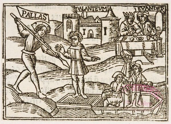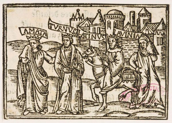 Editor: This anonymous Illustration XLIV from the Harvard Art Museums is so intriguing. It feels almost dreamlike with these figures and the strange monster. What can you tell me about it? Curator: It's fascinating how these early illustrations often circulated as part of printed books, shaping public perceptions of morality and social order. Notice the figures, their costumes, and the architecture in the background. Editor: Yes, they look like they are actively fighting something. Curator: How might the availability of such imagery shape the anxieties or aspirations of its contemporary audience? What narratives did these illustrations reinforce or challenge?