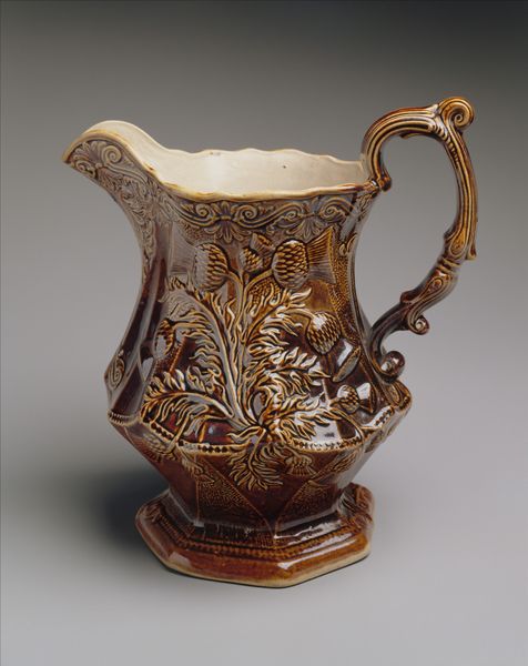 This pitcher was crafted by the United States Pottery Company in the late 19th century. Observe the abundant motifs of grapes, vines, and the lively scene of the hunt. These symbols are ancient, harking back to Dionysian revelries of classical antiquity. Grapes, intrinsically linked to wine, represent not just simple merriment but a deeper, ecstatic communion. We find echoes of this symbolism across cultures, from the Bacchic festivals of Rome to similar motifs adorning Renaissance paintings, each reiteration subtly altering the emotional resonance. The hunting scene stirs primal instincts of pursuit and dominance. Consider the transformation of the canine figure on the handle, from a mere hunting companion to a symbol of loyalty, evolving through centuries of art and lore. These images resonate so profoundly because they tap into our collective memory, a shared subconscious that evokes powerful, often conflicting emotions tied to pleasure, mortality, and the untamed aspects of human nature. The symbolism of this seemingly simple pitcher reveals how forms and figures cyclically progress through time, constantly evolving and adopting new meanings as they traverse historical contexts.