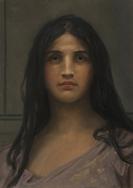 Editor: Here we have John William Godward's oil painting titled "A beauty." The direct gaze of the woman gives this piece a strikingly poised and rather stately air. What is your take on it? Curator: Her gaze is certainly commanding. To me, her unflinching stare holds a historical echo of idealized feminine beauty and power. It is not merely a physical beauty, but a projected ideal steeped in symbolic weight. Do you sense the Neoclassical references? Editor: I can see those influences. The drapery feels classical and maybe the formal composure. But the realism keeps me firmly planted in a later era. Curator: Indeed. Godward evokes an aesthetic of antiquity, yet he is clearly a product of his time, isn't he? This combination reveals how cultures continuously recycle and reimagine symbols of beauty and feminine mystique to meet their present needs. This is how icons are constructed and maintained through generations. Editor: That's a really helpful distinction. The piece isn't *of* antiquity, but *about* it. It is very telling as to what resonated as beauty. What do you think about how that is sustained here? Curator: Exactly! Her dark hair and eyebrows sharply contrast the cool light of her complexion. Consider this against the warm background and draped material—a visual harmony designed to communicate both accessibility and unattainable allure. It speaks to how even portraits aim to perpetuate symbols to endure in collective memory. Editor: I never thought about the harmony as a system for creating these symbols to endure over time. I am starting to get a feel for the iconography embedded in this seemingly simple painting. Thank you for lending your perspective. Curator: My pleasure. Hopefully it can provide some food for thought when you engage with any art!