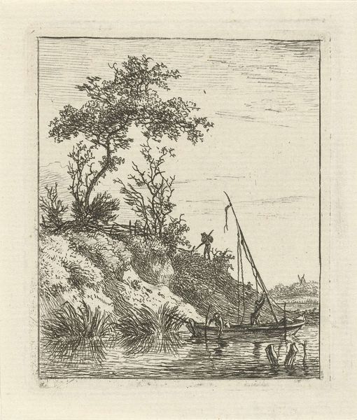 Editor: So, here we have Allart van Everdingen’s "Sea Piece with Three Figures to the Right," likely created sometime between 1621 and 1675. It's an etching, so a print on paper. It's mostly monochrome and appears somewhat bleak and sparse. How do you interpret this work? Curator: I would argue the effectiveness of this print lies precisely in that calculated "sparseness." Consider the composition; the artist masterfully balances the dense, almost baroque rock formations and figures to the right, against the open expanse of sea and sky to the left. This dichotomy guides the eye, doesn’t it? Editor: I see what you mean about the contrast, but the rock formation seems a bit overwhelming in terms of detail compared to the rest. Curator: Note how the texture created by the etching technique contributes significantly. The density of lines in the rocks versus the comparatively lighter touch used for the sky is what creates a sense of depth and form. Without that, you wouldn’t have this striking opposition that defines the artwork. Do you agree that the relationship between the medium and subject matter are interlocked? Editor: That’s an interesting point! So you are less concerned with what's depicted - figures, boats, water – and more focused on the visual language and balance? Curator: Precisely. By understanding this visual vocabulary—the interplay of line, texture, and composition—we appreciate the work's formal qualities, independent of subject matter or historical context. Editor: Okay, I think I’m starting to get it. Focusing on the "how" rather than the "what." Thanks for that new perspective! Curator: My pleasure! Examining form is essential in deciphering how art communicates.