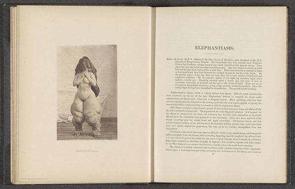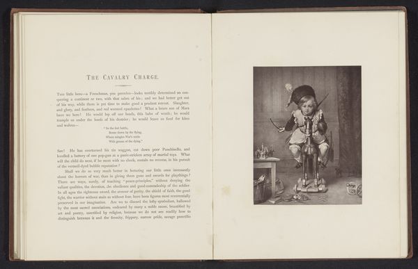 Curator: Here, displayed in a reproduction within the leaves of an old book, we have “The Little Philosopher.” This gelatin-silver print, crafted by J.A. Brush, likely dates from before 1895. Editor: There's a starkness to it, wouldn’t you say? A solemn child, eyes upturned toward a single dark balloon. It feels so weighted somehow, a miniature adult lost in thought. Curator: I find the balloon interesting—like a thought bubble made tangible. The book it is printed on offers instructions for early photographic processing. Maybe it serves as a metaphor for ephemeral thoughts? Editor: Maybe it is a world, right there floating above his head. Children have a capacity for existential questioning, so maybe we underestimate a little person's imagination and sense of the wider universe? The text itself reads, “Plates for Hot Weather,” which seems completely unrelated, lending to the photograph's ambiguous charm. Curator: The juxtaposition is almost jarring. Instructions for photo processing next to this poignant image...it's a beautiful and strangely powerful contrast. Is this, maybe, a child philosopher seeking wisdom from the ether? Or maybe seeing more than most adults around? Editor: The high-contrast monochrome really underscores the gravity, but also the potential for enlightenment and transformation—that is captured here on the verge. Also, children appear repeatedly in photography, with great emotional resonance across history. Is that to capture innocence or a potential future? Curator: Both? The way childhood and philosophy are linked is, as always, an invitation to see and feel in ways long past our reach. I agree it works perfectly on both levels, and with our modern gaze in 2024, it feels refreshing, almost new, doesn’t it? Editor: Absolutely. An artifact hinting at deep thoughts—the kind only a small child is equipped to ponder, I am convinced!
